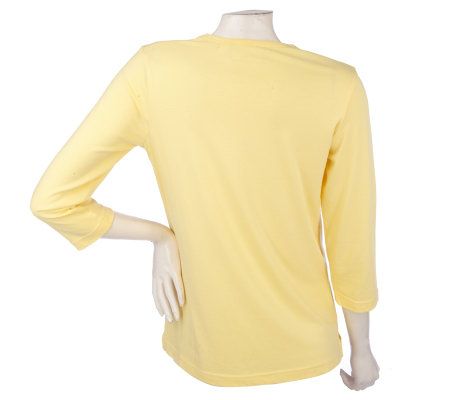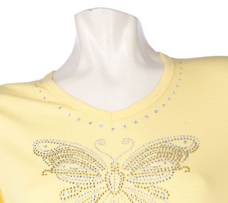 Your favorite T-shirt just got some glitz. Adorned with a beautiful butterfly motif, this stretch shirt is not only stylish, it's comfy thanks to 3/4-length sleeves, a V-neckline, and side slits. Rhinestones and stud detailing add glittery fun to the butterfly design. From Quacker Factory.