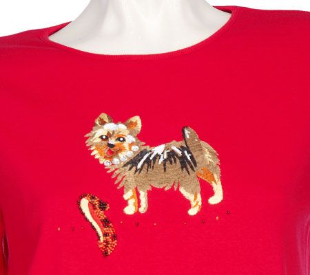 Pet pride. This knit top features the cutest little critters with embroidered details and bead and stone embellishments. The 3/4 length sleeves and side slits make it a comfortable and fun favorite. From Quacker Factory.