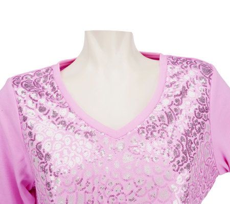 Go wild! Let your fun and fabulous sense of style shine in this V-neck T-shirt. It glitters with an array of sequins in a leopard pattern. From Quacker Factory.
