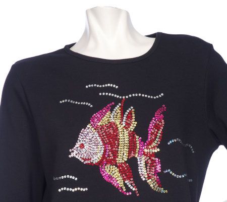 Don't just wade into style--dive in with this sparkling ocean-themed T-shirt. Sequin embellishments depicting one of the seven seas' finest decorate the front. From Quacker Factory.