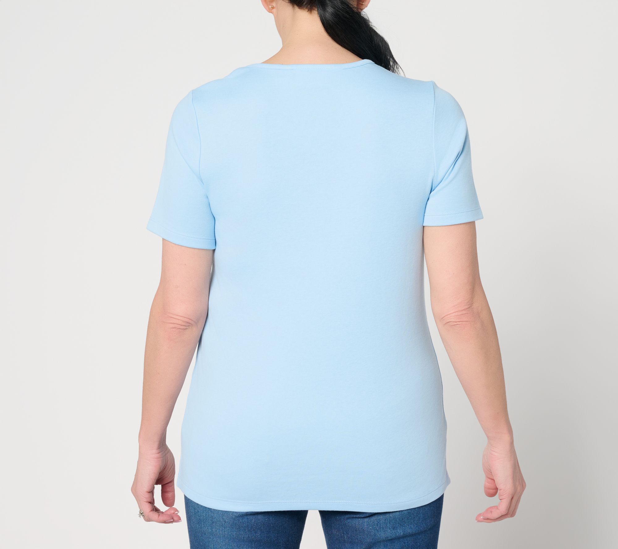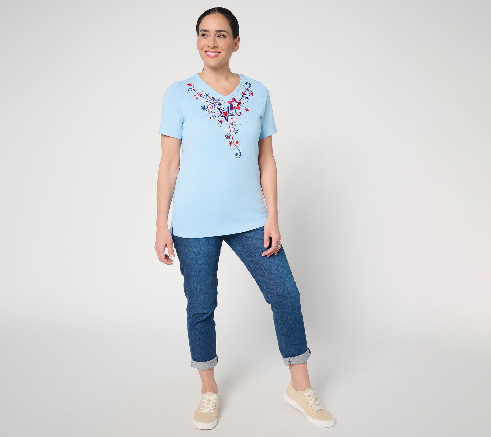 Say yes to playful style with a nod to whimsy -- this Aim for the Stars top stands out with embroidered stars artfully framing the neckline and cascading down the front. Soft knit construction and side slits at the hem keep it comfortable when you're on the move, while short sleeves make it warm-weather ready. A cheerful pick for layering with cardigans, pairing with jeans, or brightening up your everyday moments. From Quacker Factory®.