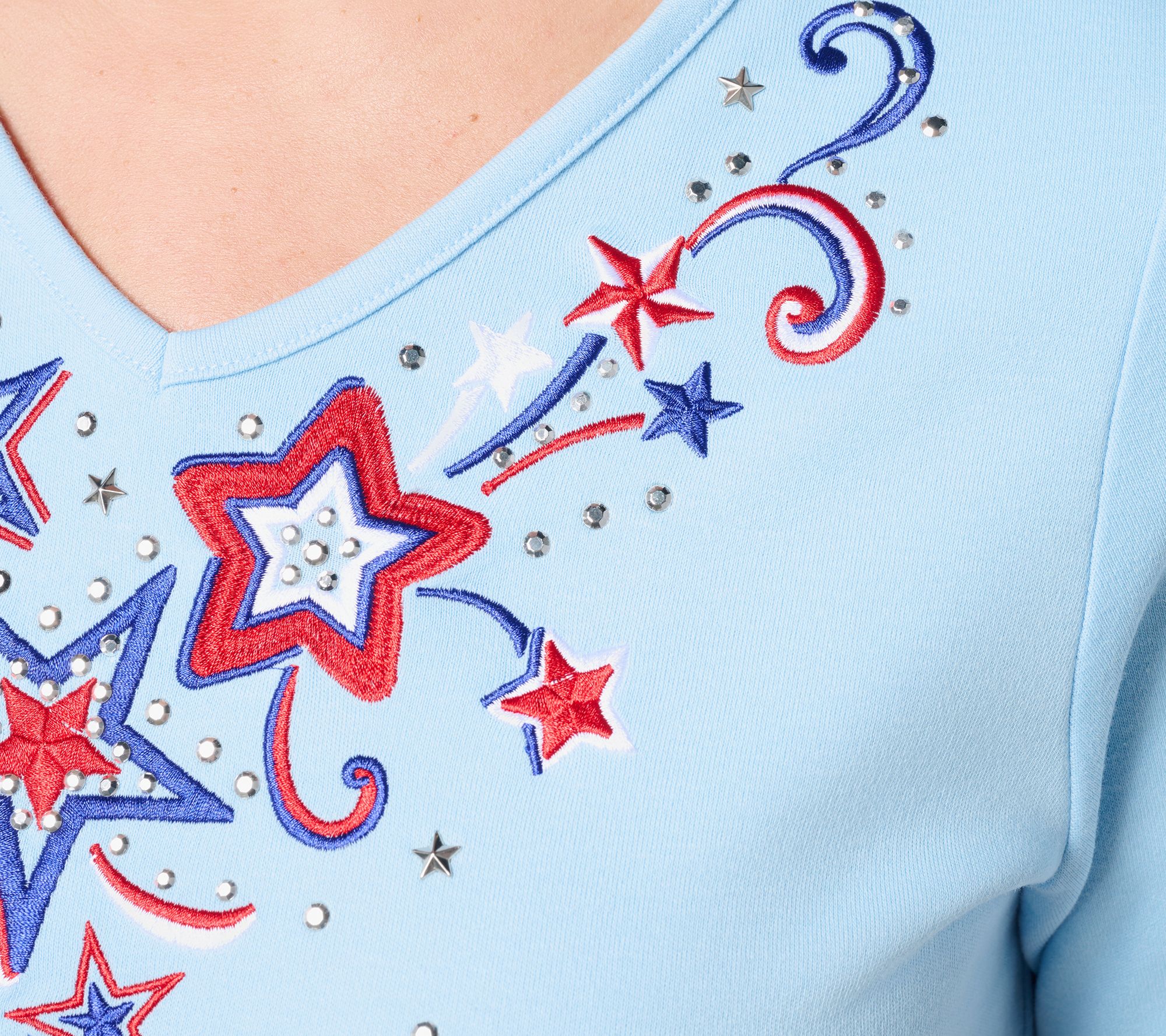 Features: V-neckline, short sleeves, embroidered stars at neckline and down front, side slits at hem