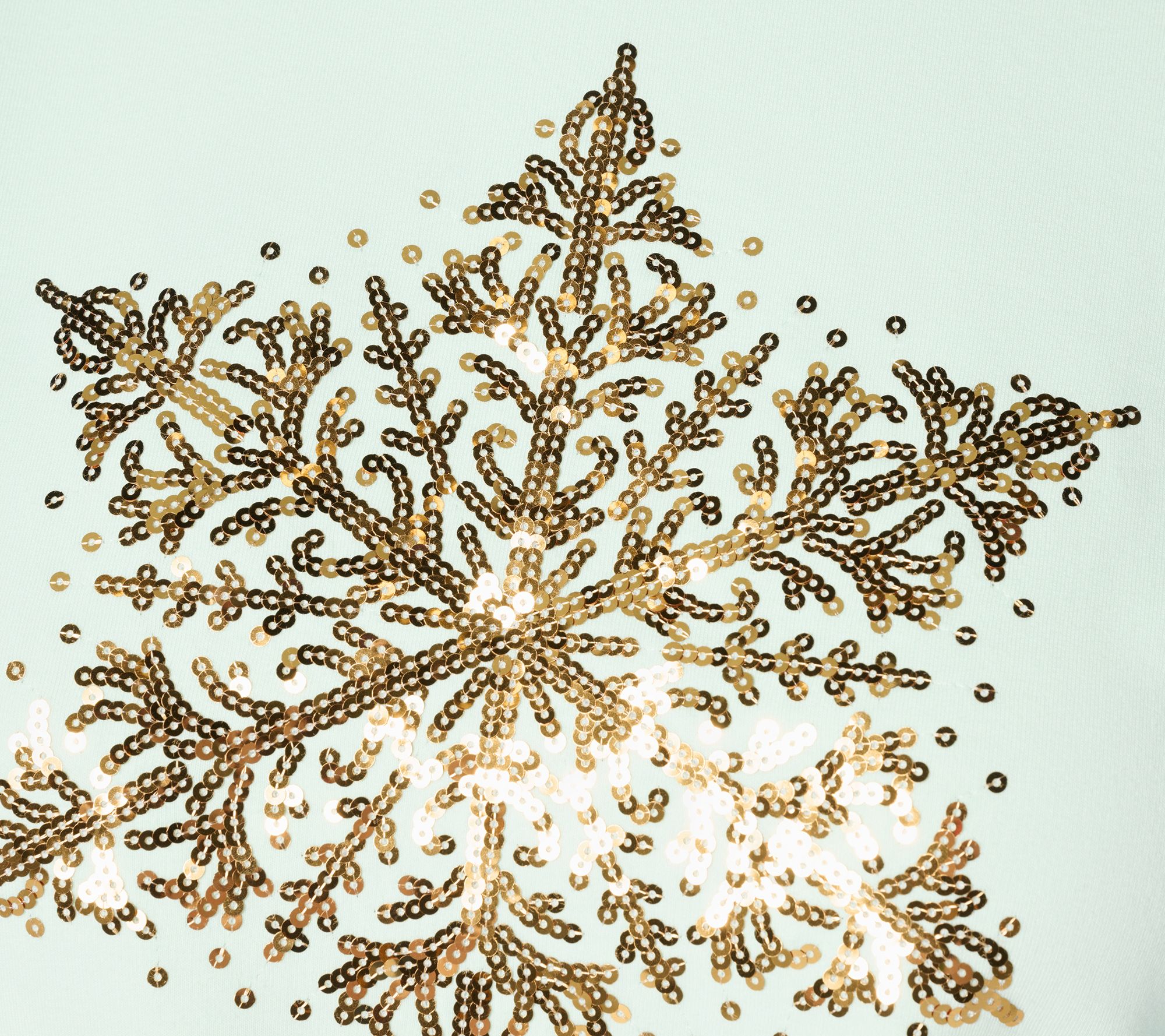 Snag your chance to sparkle -- whether you're meeting friends, hosting a holiday party, or cookie baking at home. This long-sleeve pullover brightens the day with twinkling sequin snowflake accents. The soft cotton-rich fabric provides all-day comfort and cheerful style you'll love to wear beyond the season. From Quacker Factory®.