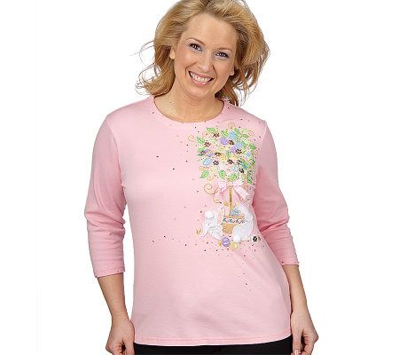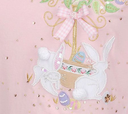 An egg-citing Easter motif--done in embroidery and sequins--lends hoppin' holiday style to this knit top. It's a fun and stylish way to celebrate the season. From Quacker Factory.