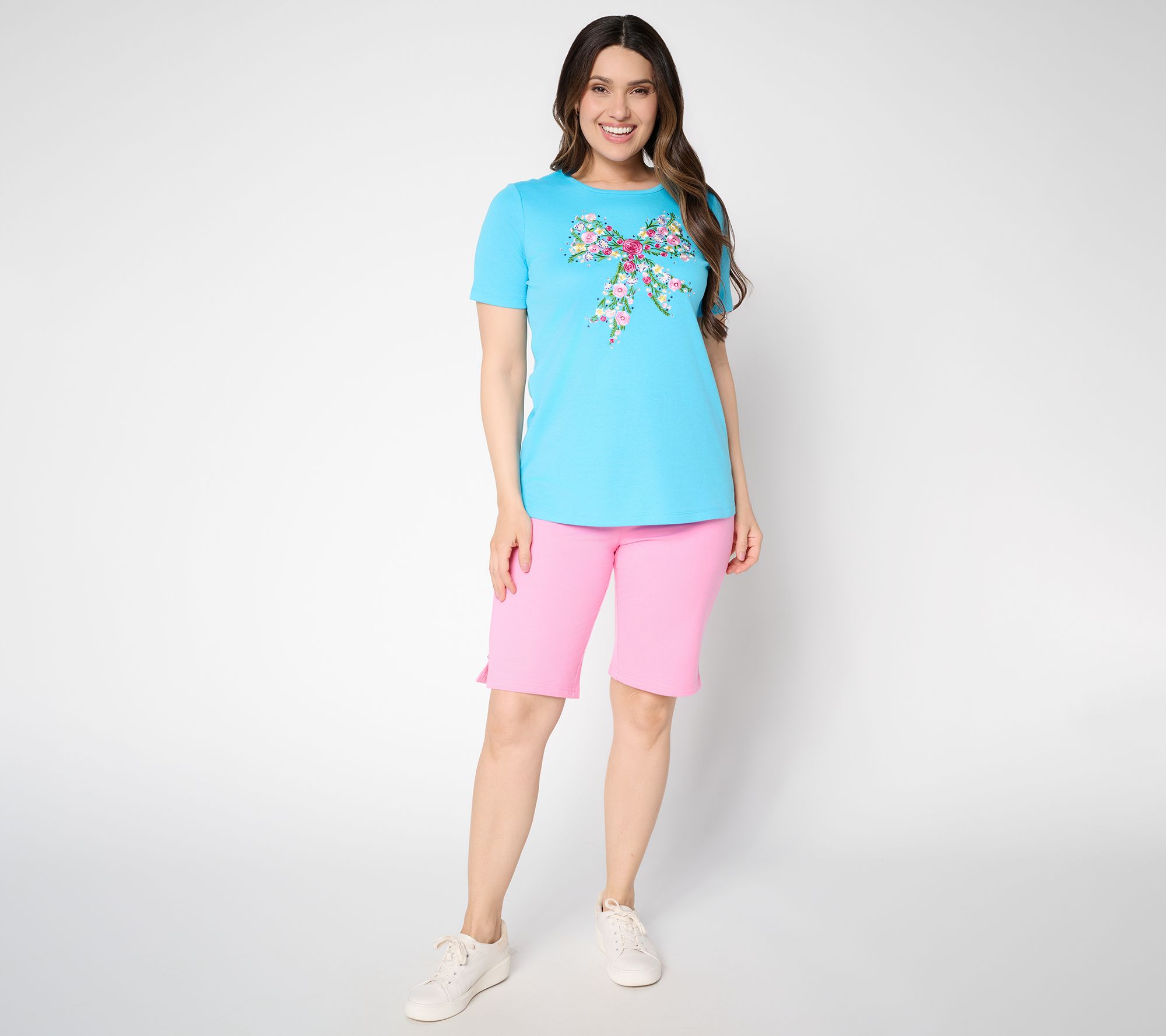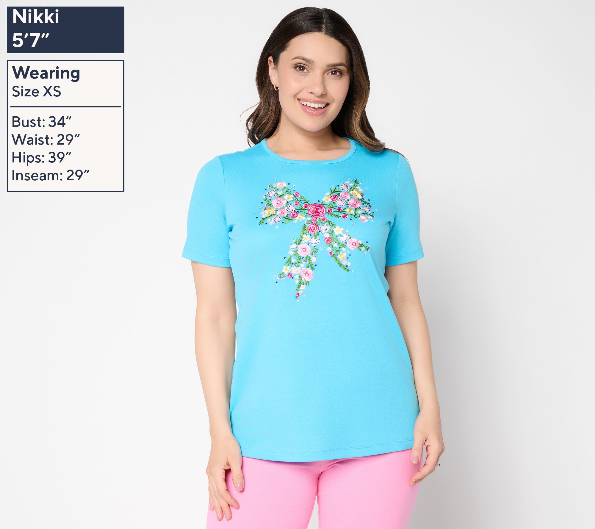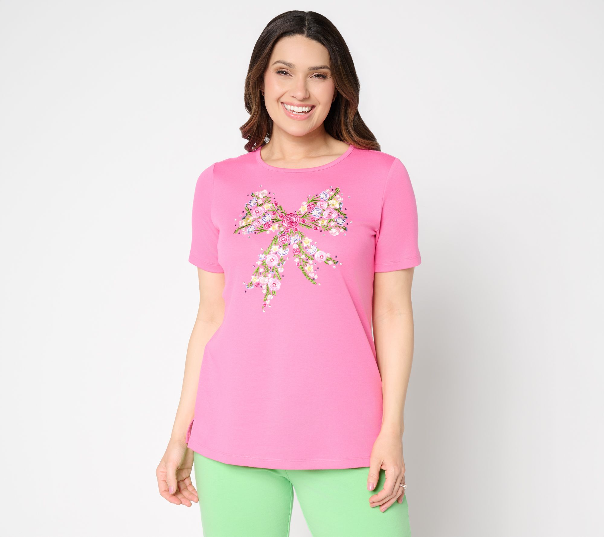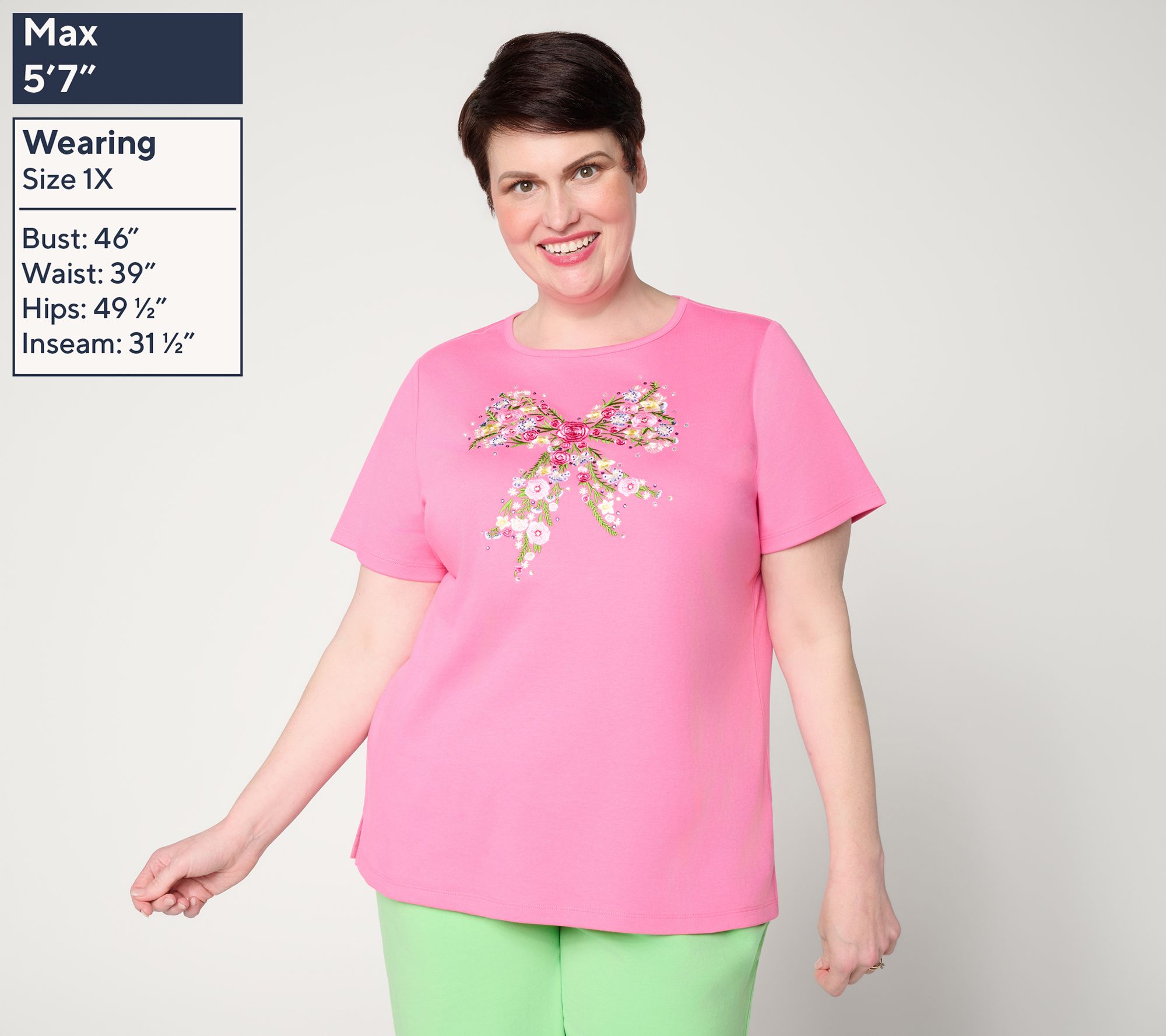 Brighten up your everyday with this short-sleeve top, featuring a cheerful bouquet bow detail, classic round neckline, and comfortable fit that makes it easy to pair with your favorite jeans or shorts. A straight hem with side slits lends freedom of movement for all-day wear. From Quacker Factory®.