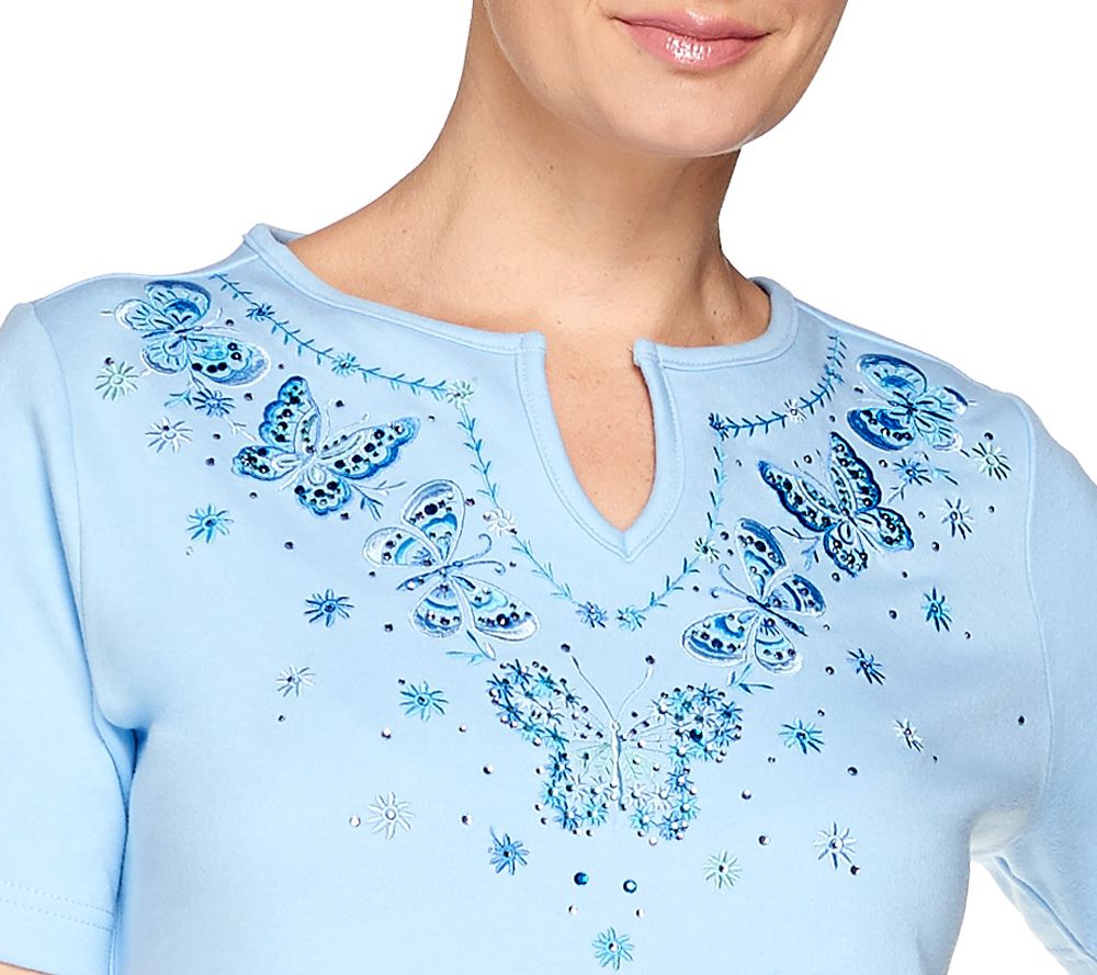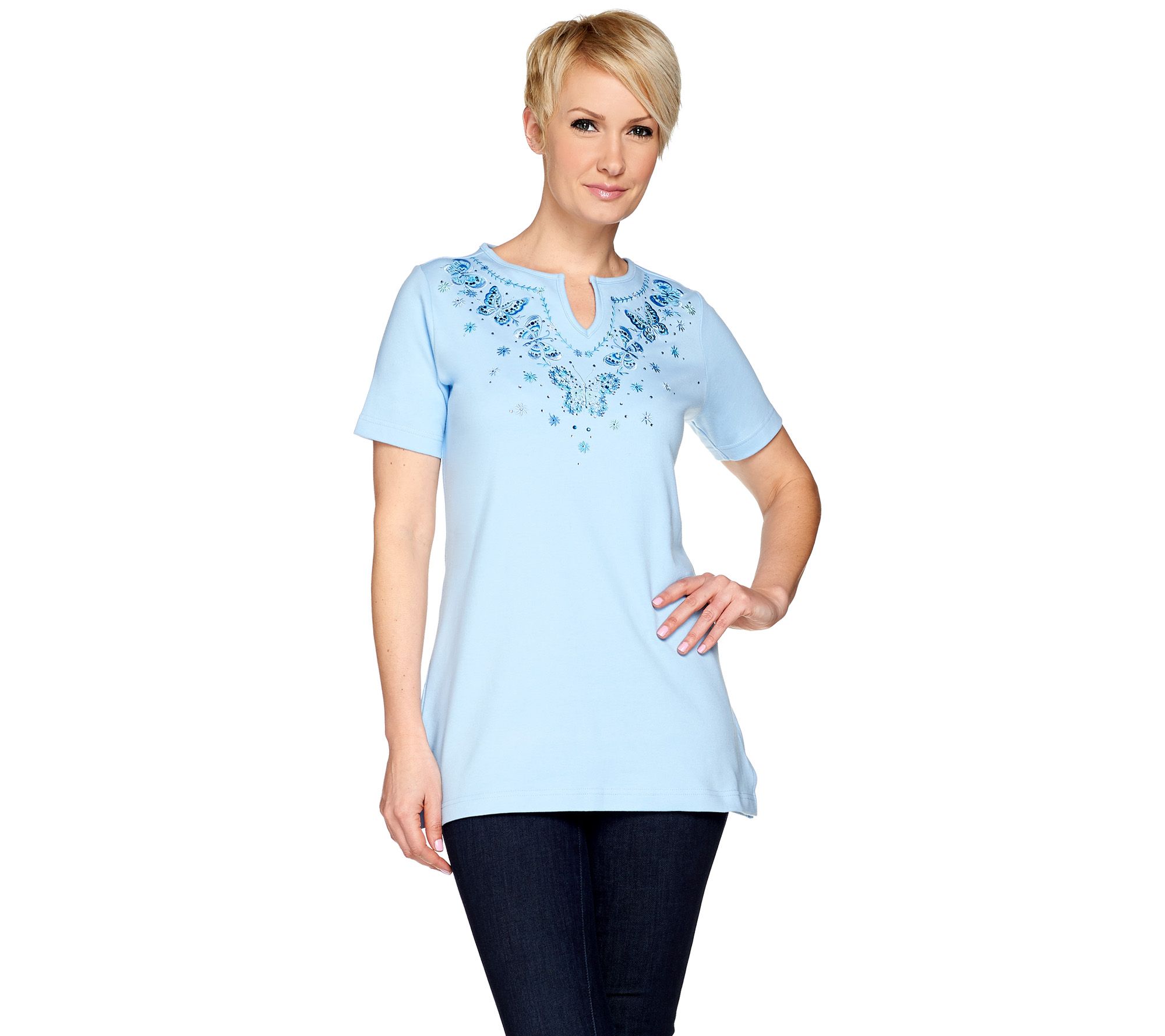 Flit, flutter, fly. Spring for a little sparkle in your life with this Quacker Factory(R) short-sleeve tunic, featuring beautiful butterfly embroidery on the split neckline and gorgeous rhinestone embellishments. From Quacker Factory.