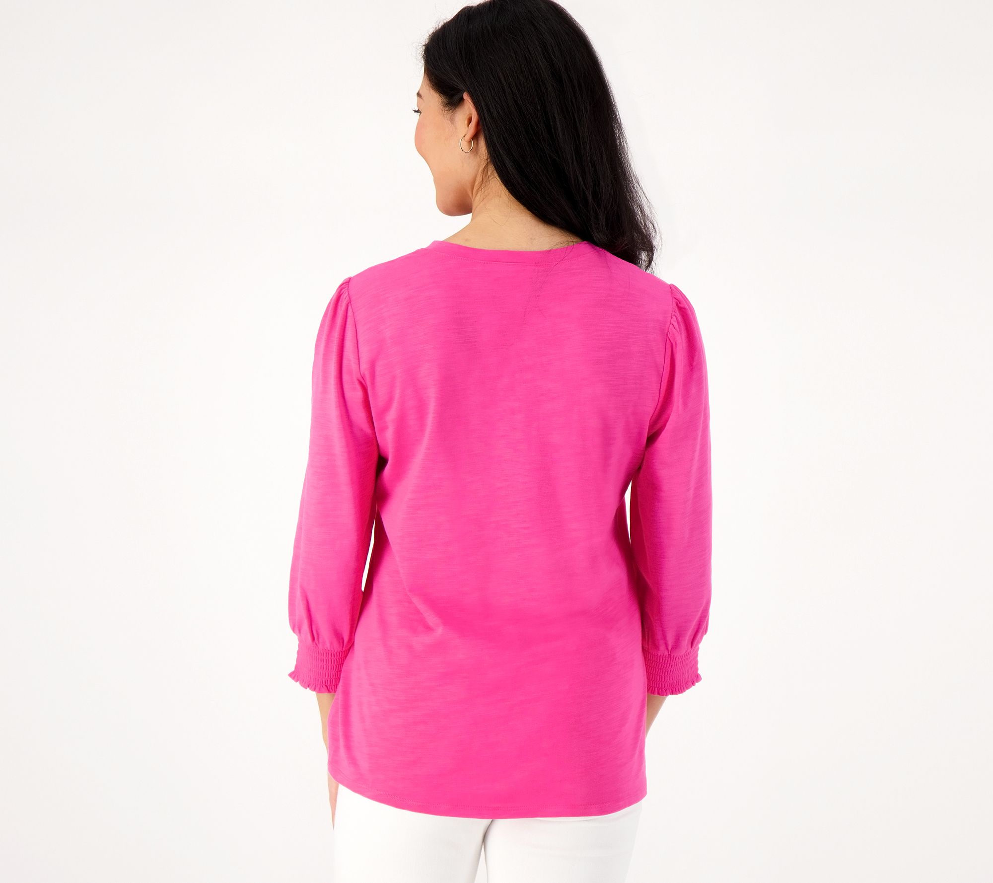 • Features: V-neck, daisy embroidery, 3/4-length sleeves with smocking at cuff, gathering at sleeve cap, side vents