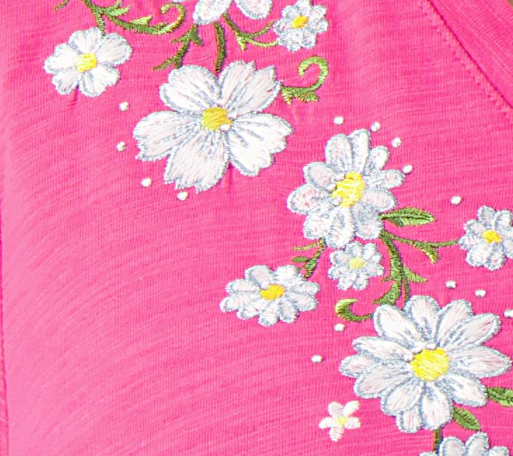 Not just for flower beds or tabletop arrangements, these daisies daintily decorate the decollete of this comfy slub knit top. Enjoy their blossoms all season long (no watering required). From Quacker Factory®.