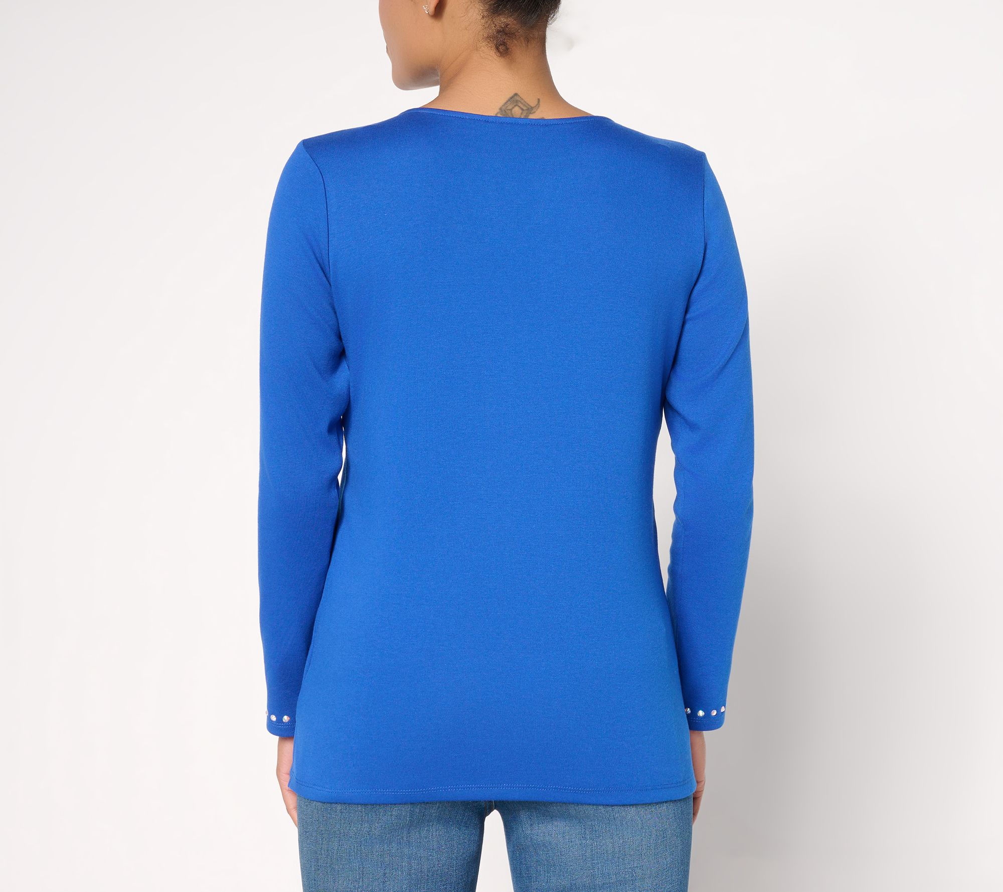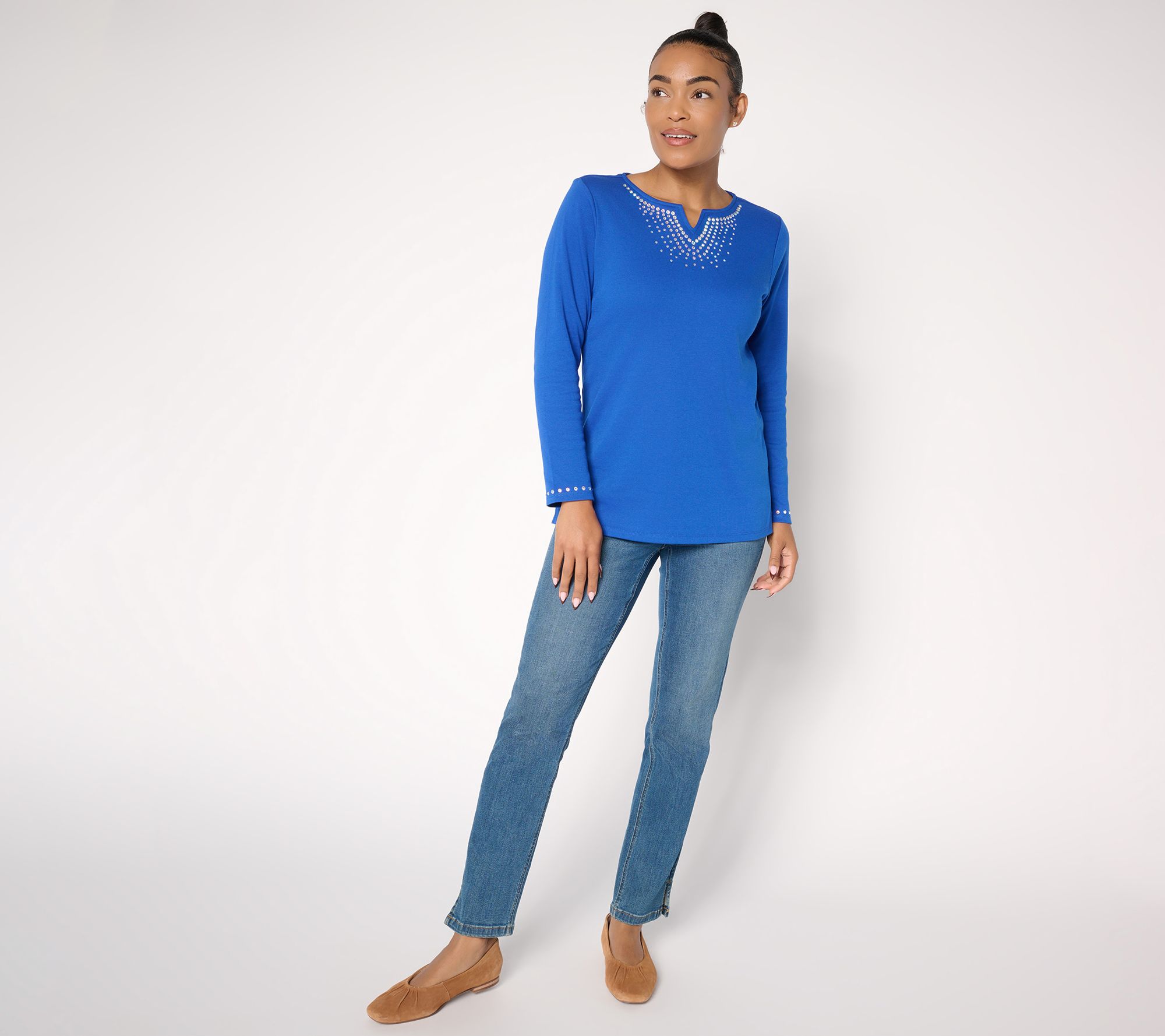 Dress up your denim! With a splash of rhinestone accents, this comfy knit top gives your go-to bottoms a glam glow-up. From Quacker Factory®.