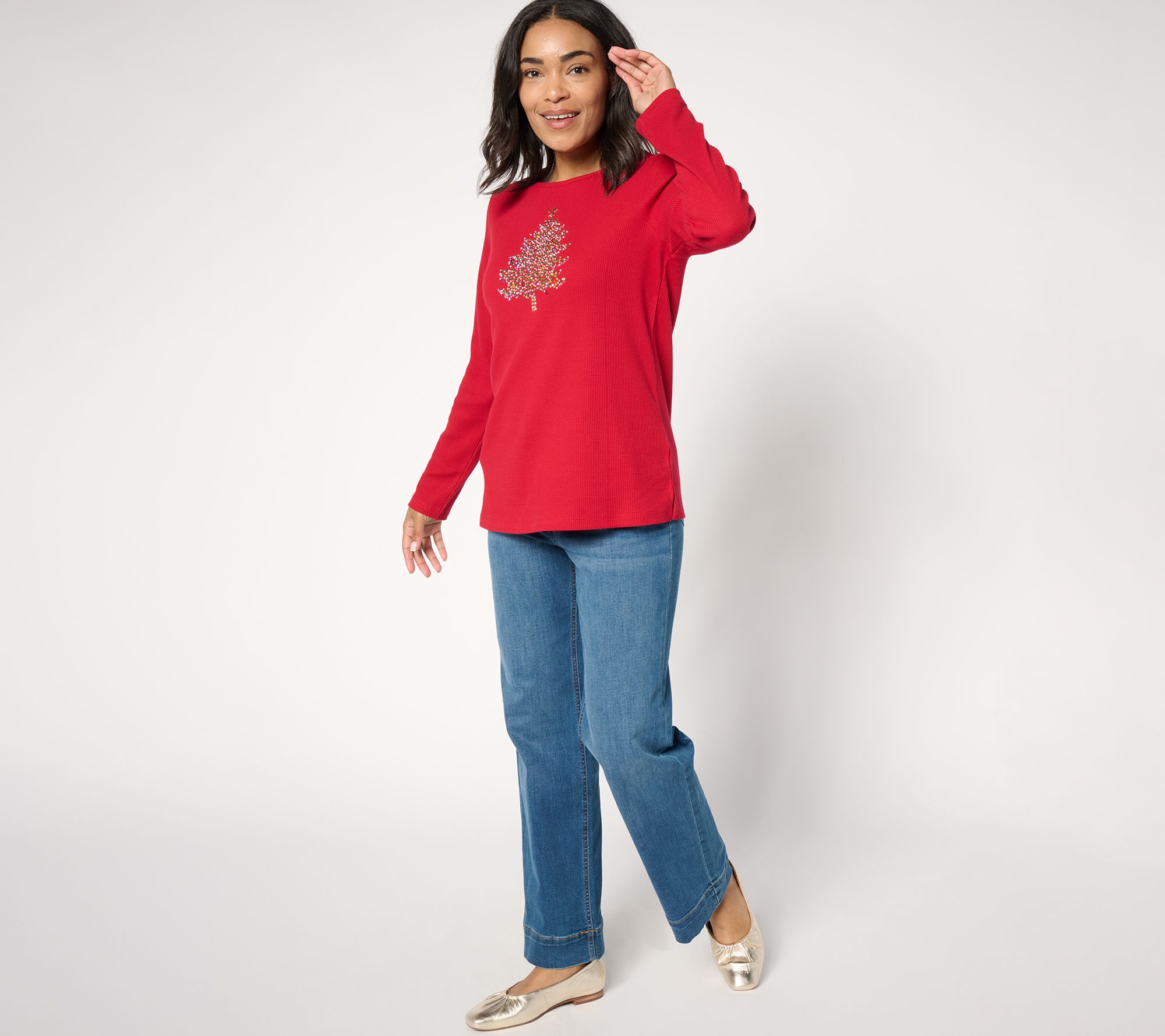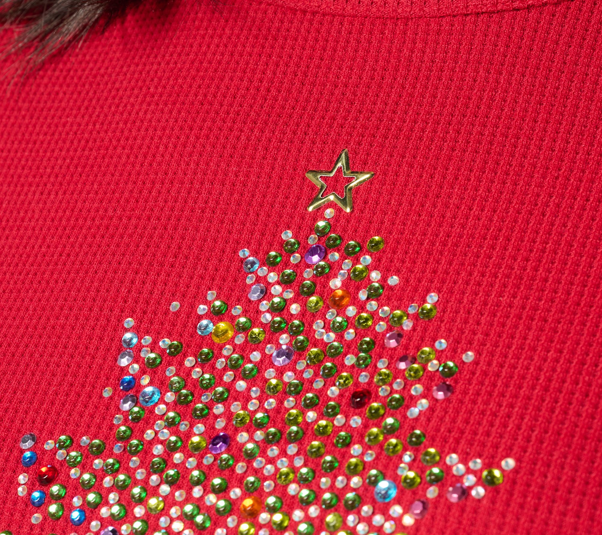 We see you sparkling! Share your joy for the season with friends, family, and a few strangers you see along the way in this shimmering Christmas top crafted from a comfy-cozy waffle knit. From Quacker Factory®.