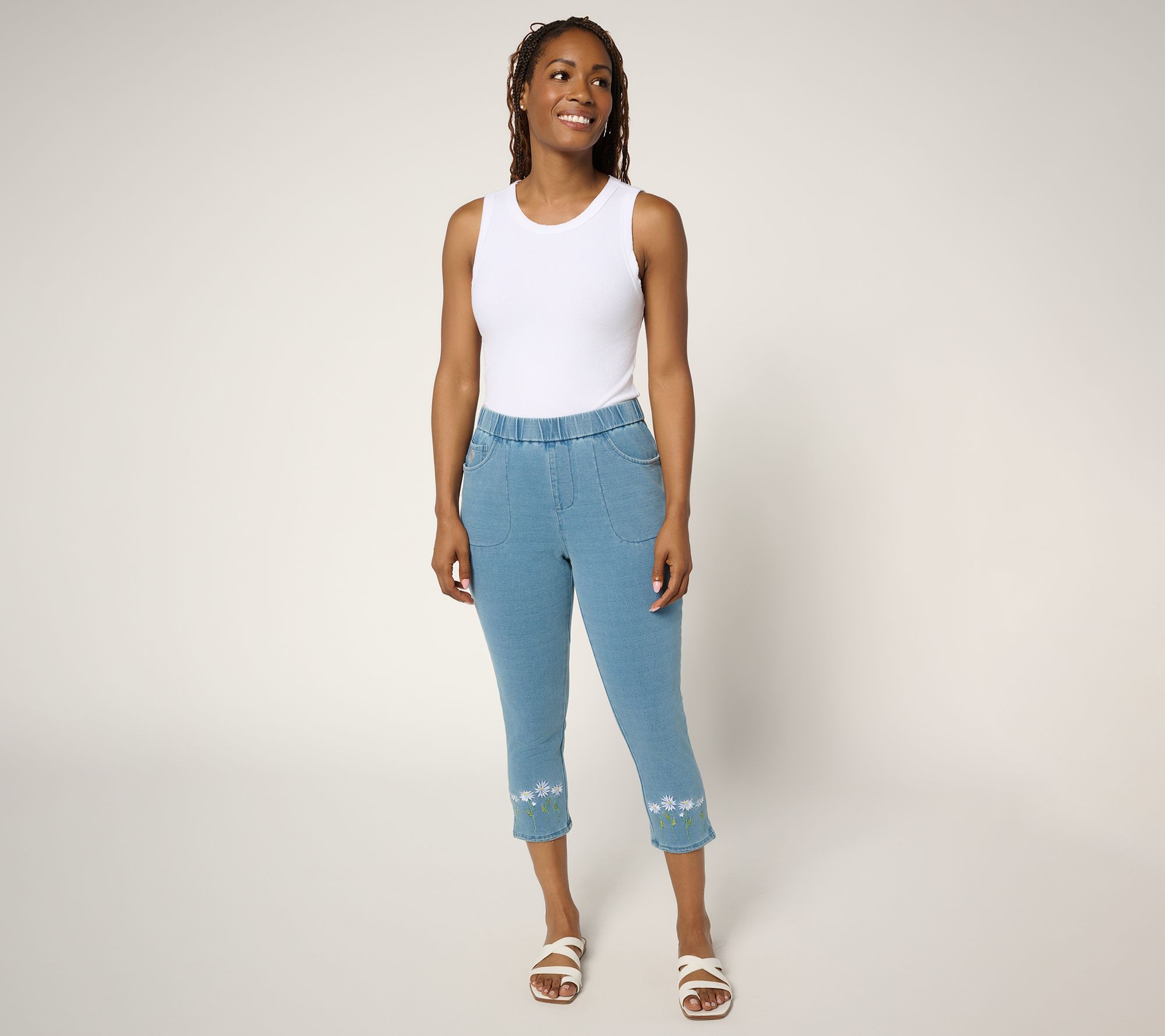 Brighten up your wardrobe with these playful capri pants, featuring charming daisy embroidery to add a whisper of whimsy to your day. Whether you're sipping coffee at a sidewalk cafe or strolling through a sunny park, these comfy knit DreamJeannes will have you looking fresh as a daisy. From Quacker Factory®.