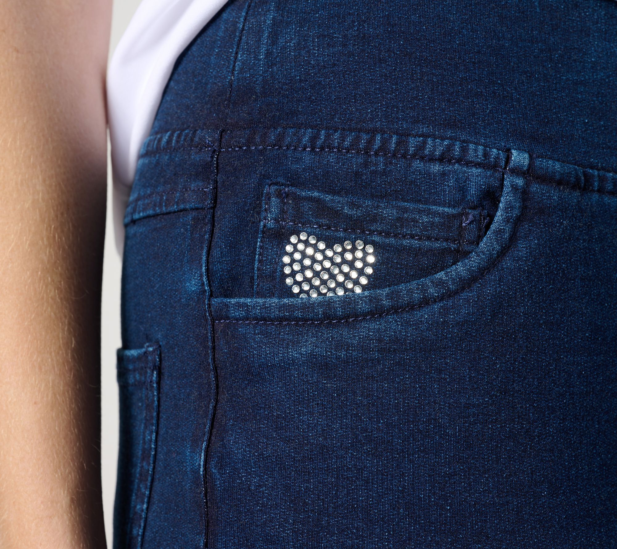 - Features: cropped, pull-on style, flat elastic waistband, five-pocket styling, back yoke, faux fly, side vents