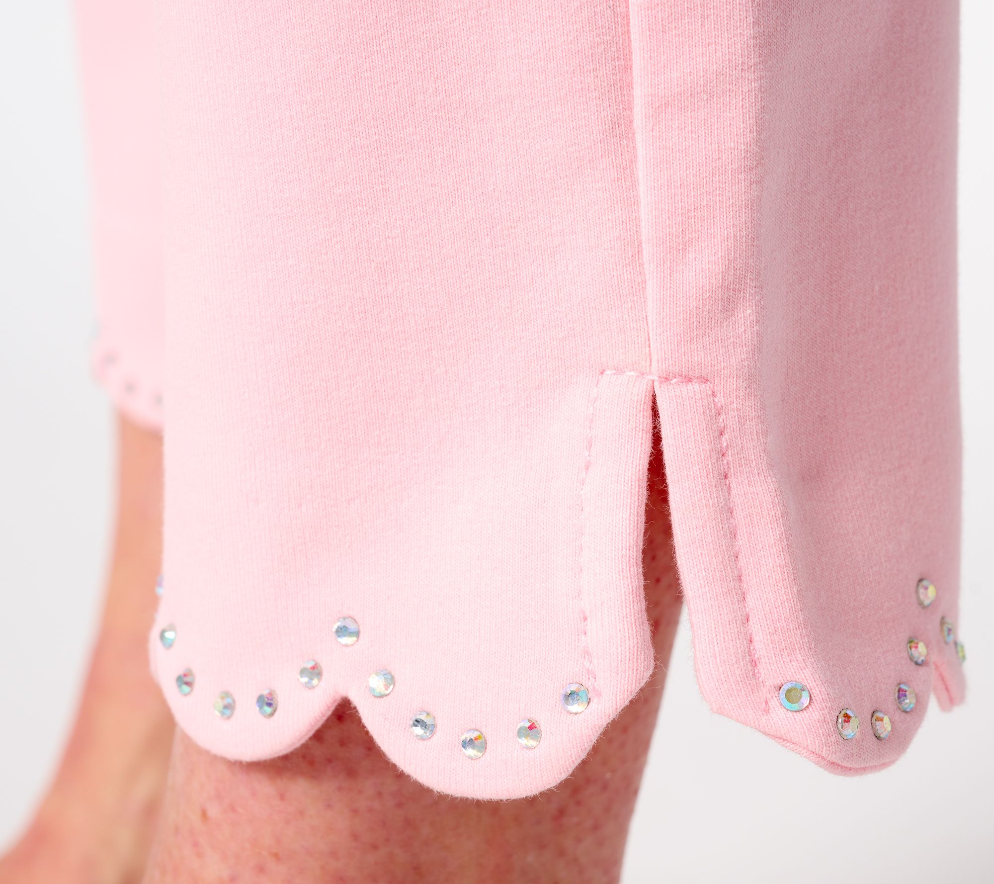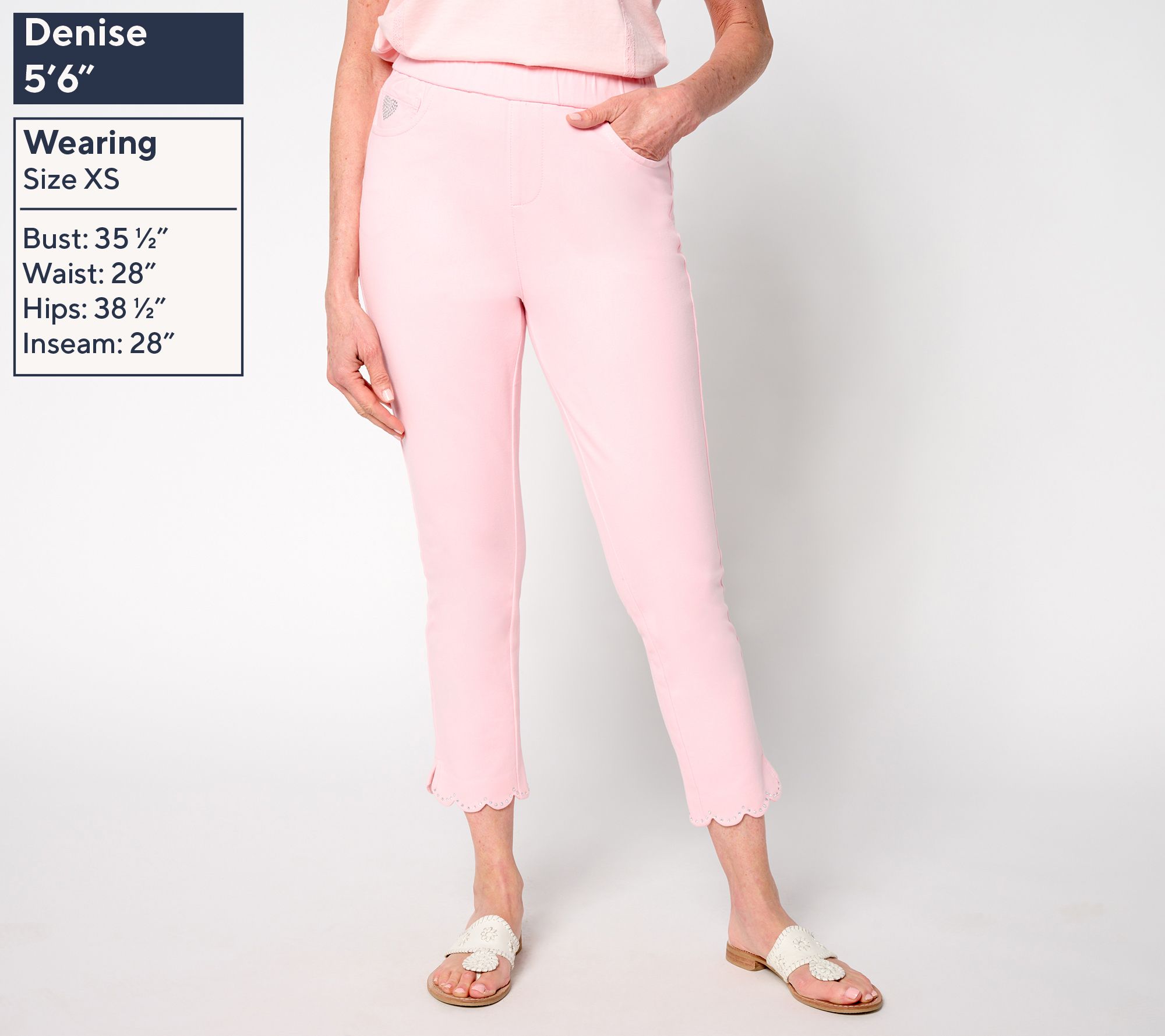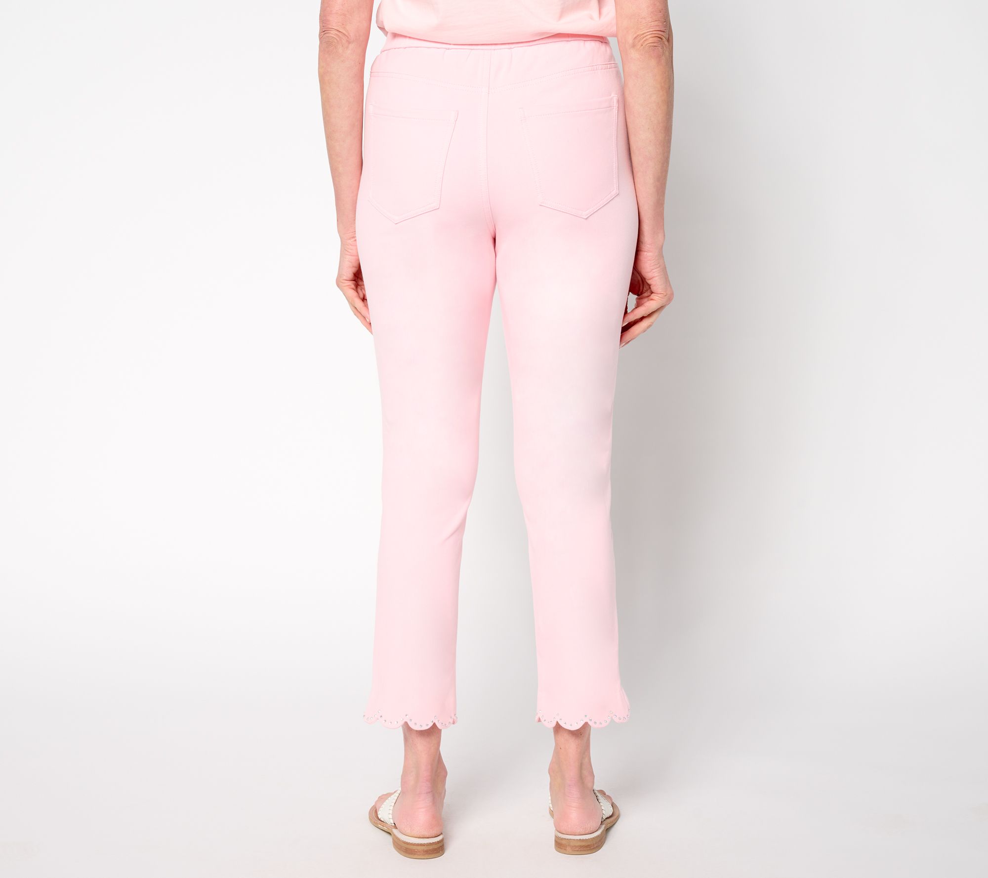 Never afraid to have a little fun with fashion, Quacker Factory gives the classic crops a little extra playful energy with a scalloped hem and sparkle details. Masquerading as a woven denim but crafted in a soft DreamJeannes knit, these easy pull-on pants flex for feel-good-all-day vibes. From Quacker Factory®.