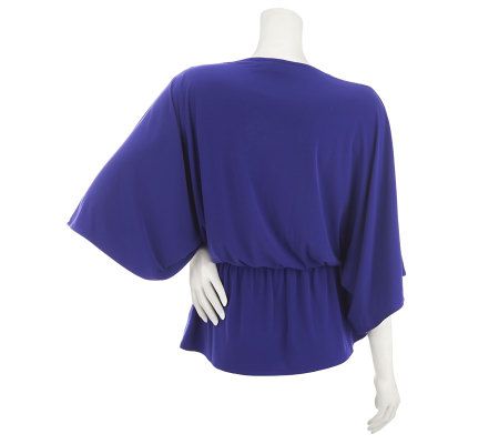 Dreamknit tunic; 3/4-length, kimono-style sleeves; rhinestone embellishment at the neck; drawstring waist
