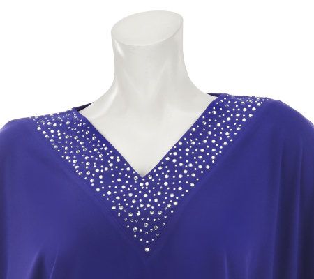 Everyday glam. Slip this rhinestone-embellished top on over a tank, or by itself for sparkling style. A drawstring at the waist gives it shape, while kimono sleeves add flattering coverage. From Quacker Factory.