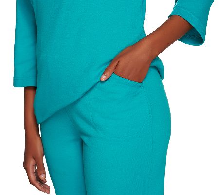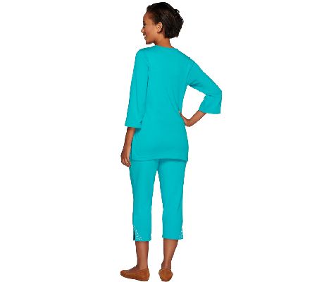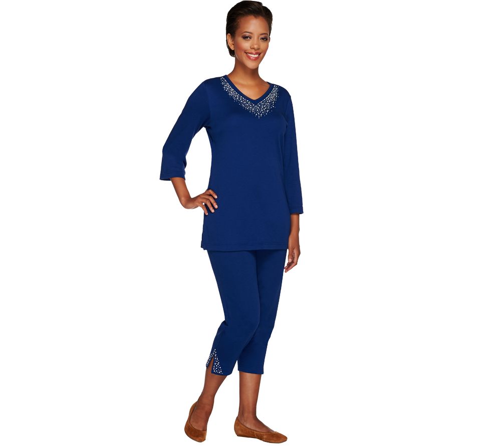 Dazzling duo. Quacker Factory's Pearls Just Want To Have Fun tunic and pants set will have you looking as good as you feel every time you wear it. With sparkling rhinestone and simulated pearl details along the V-neckline of the tunic and hem of the pants, this set has just enough flair to keep you fabulous, while the comfortable knit fabric puts the fun in functional. Plus, it's a perfect transitional look from summer to fall with 3/4-length sleeves and crop-length pants--so go ahead, sparkle through the seasons in standout style. From Quacker Factory.