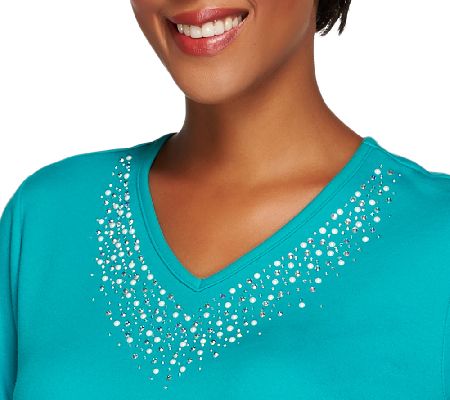 • Tunic Features: V-neckline, 3/4-length sleeves, simulated pearl and rhinestone detail along neckline