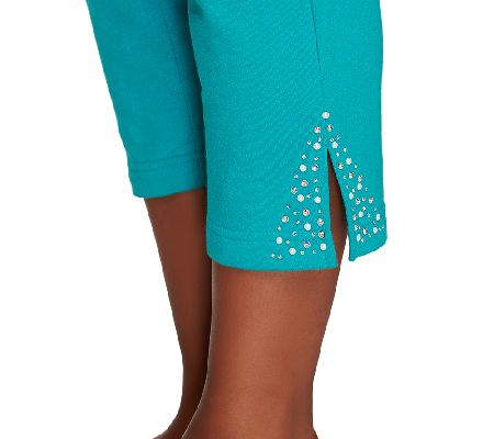• Pants Features: crop length, pull-on style, functional front pockets, simulated pearl and rhinestone detail on hem
