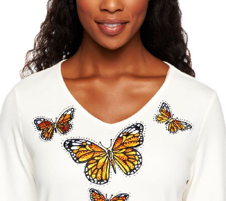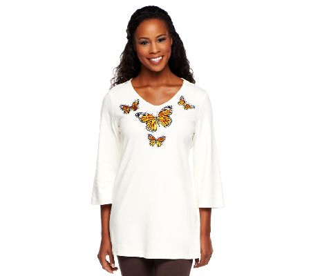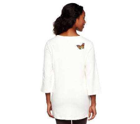 When the autumn wind comes blowing in, find yourself prepared. Featuring versatile 3/4-length sleeves and a straight hem with side slits, this pretty top will have you looking forward to fall. From Quacker Factory(R).