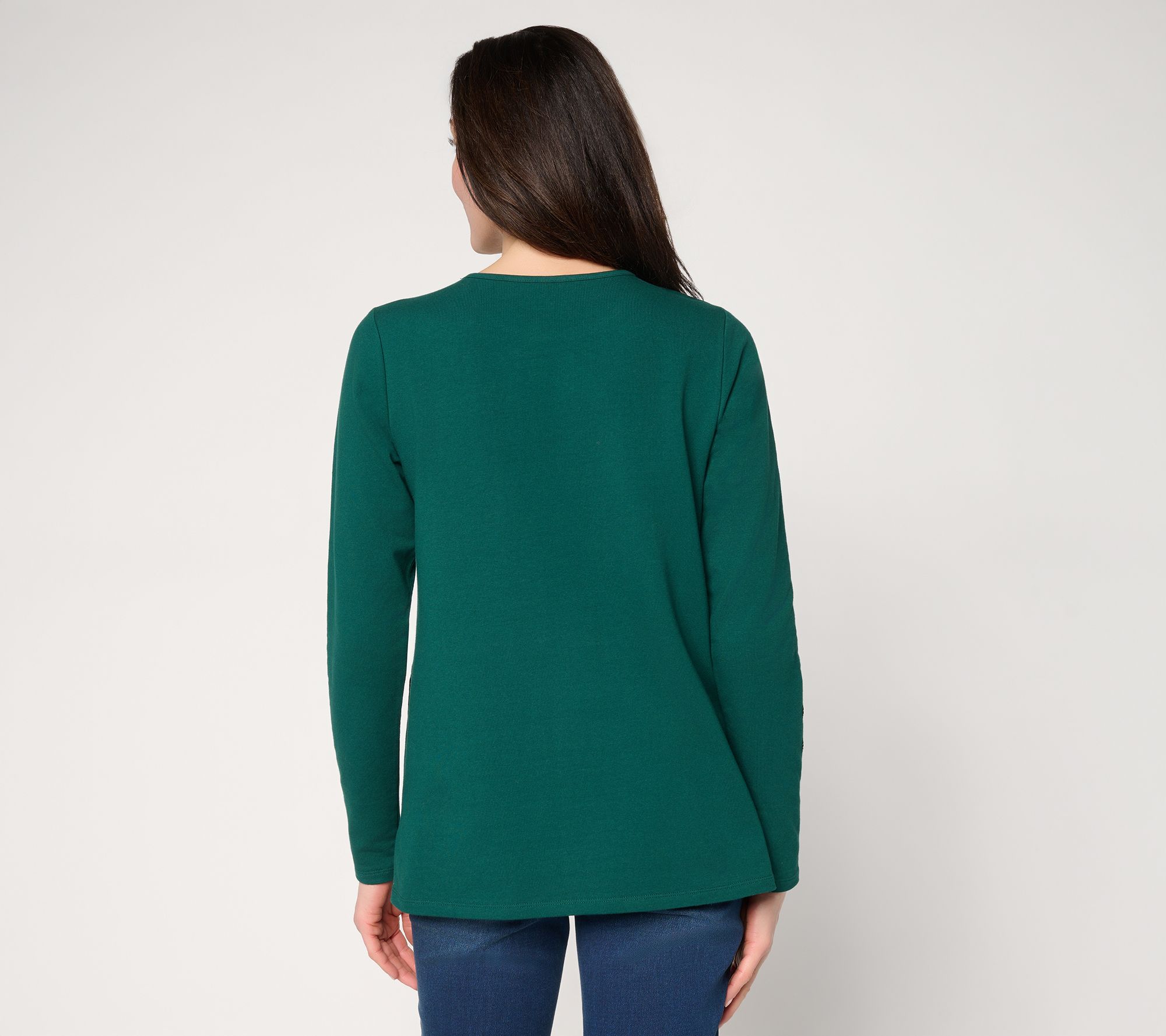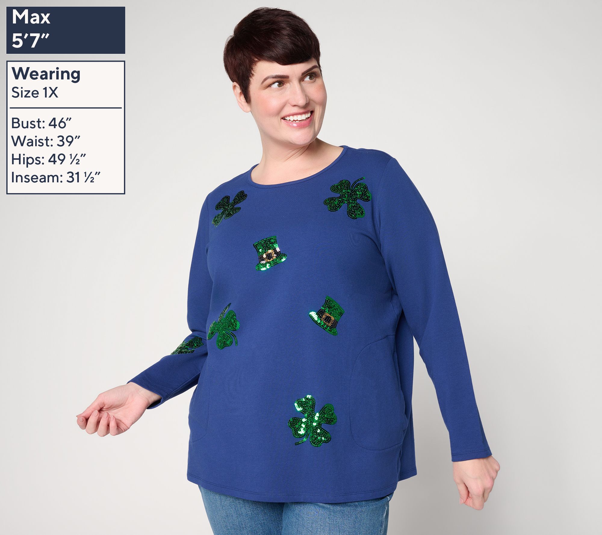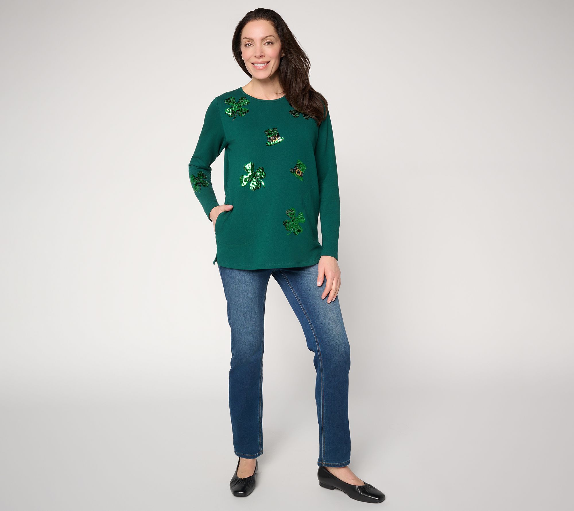 Feeling lucky? You are when you're wearing this too-cute French terry long-sleeve top that delivers easygoing style with a comfortable fit. The round neckline, side slits, and straight hem make everyday wear effortless -- just add your favorite jeans or leggings for an instant look you'll love. From Quacker Factory®.
