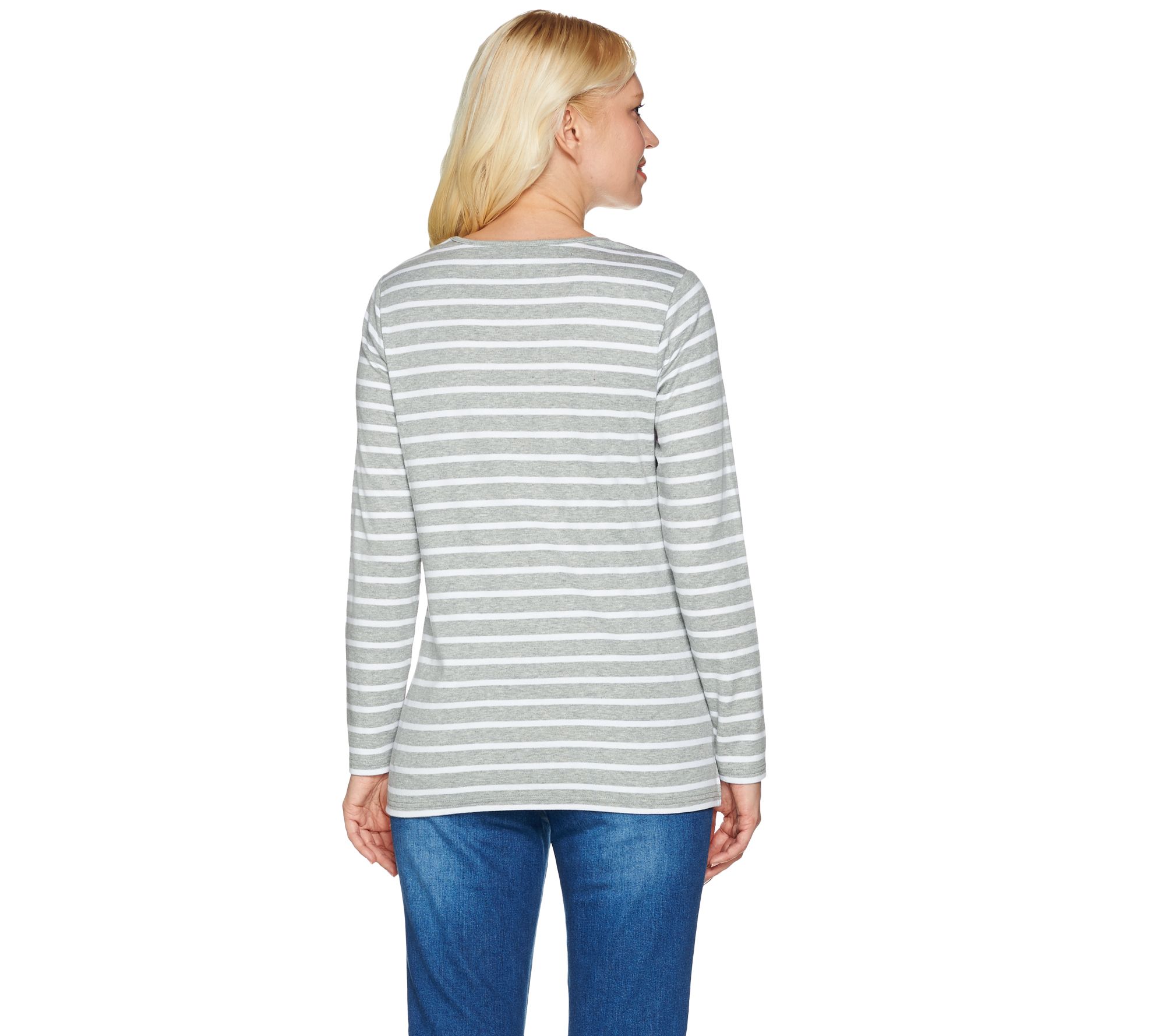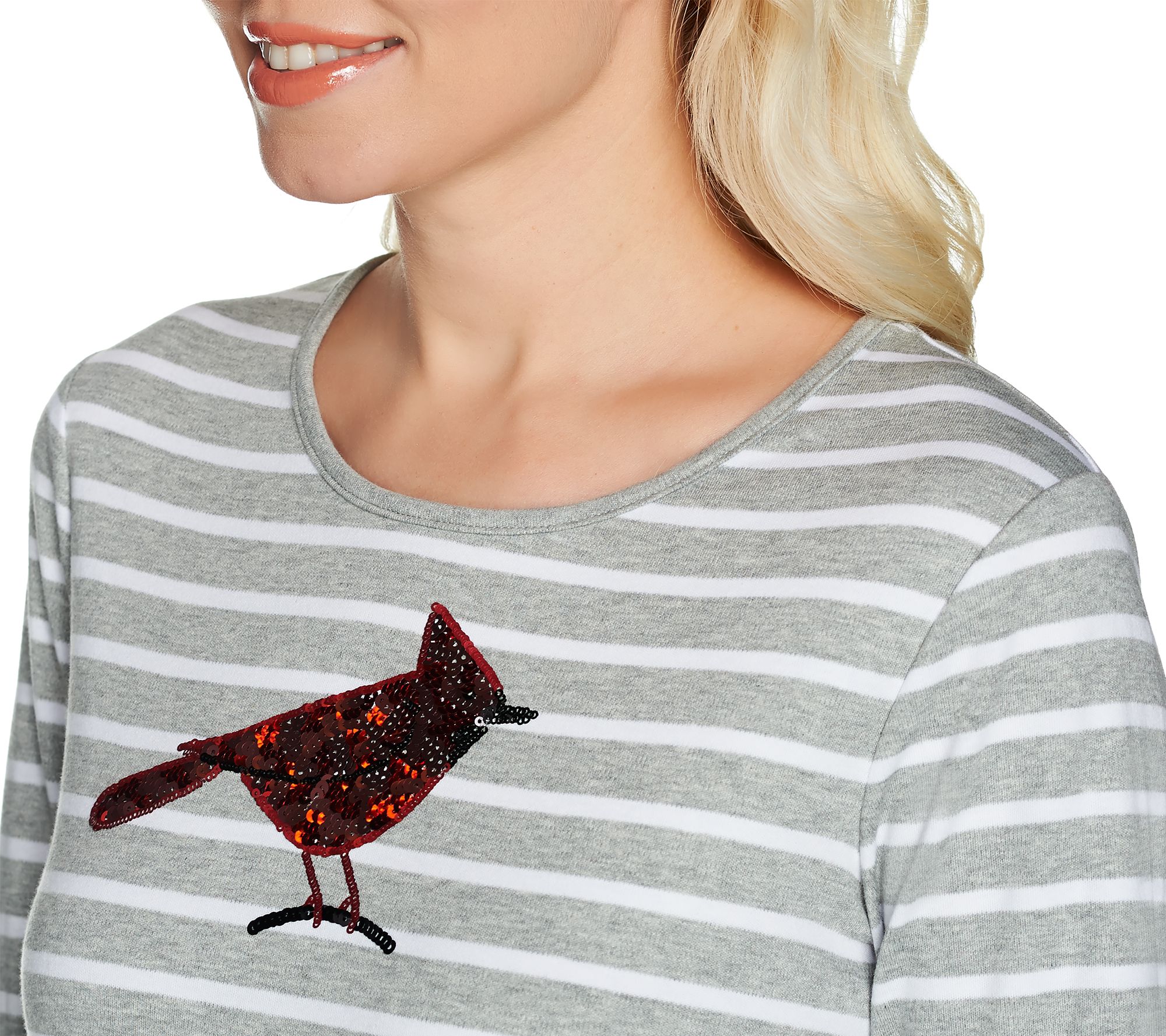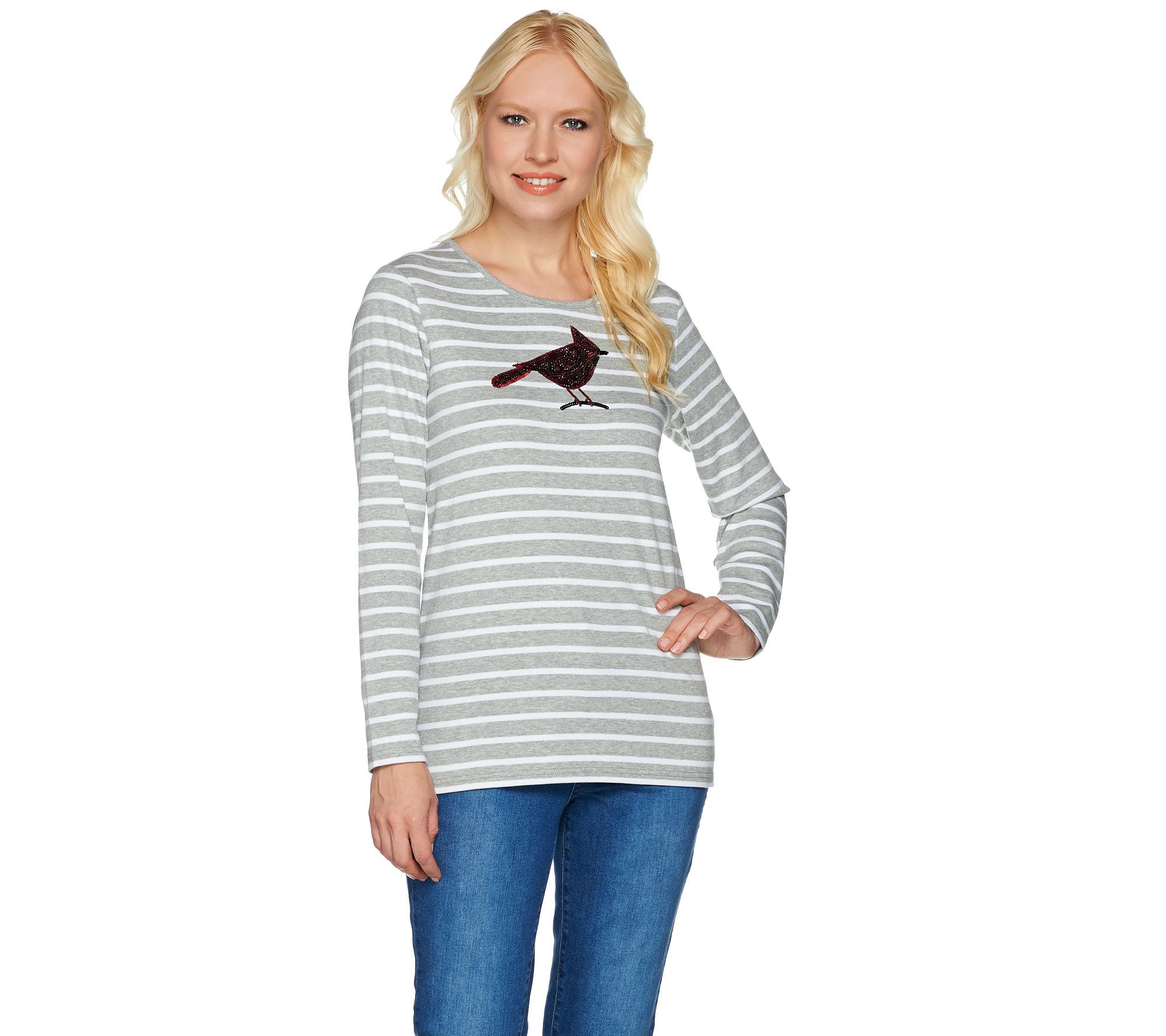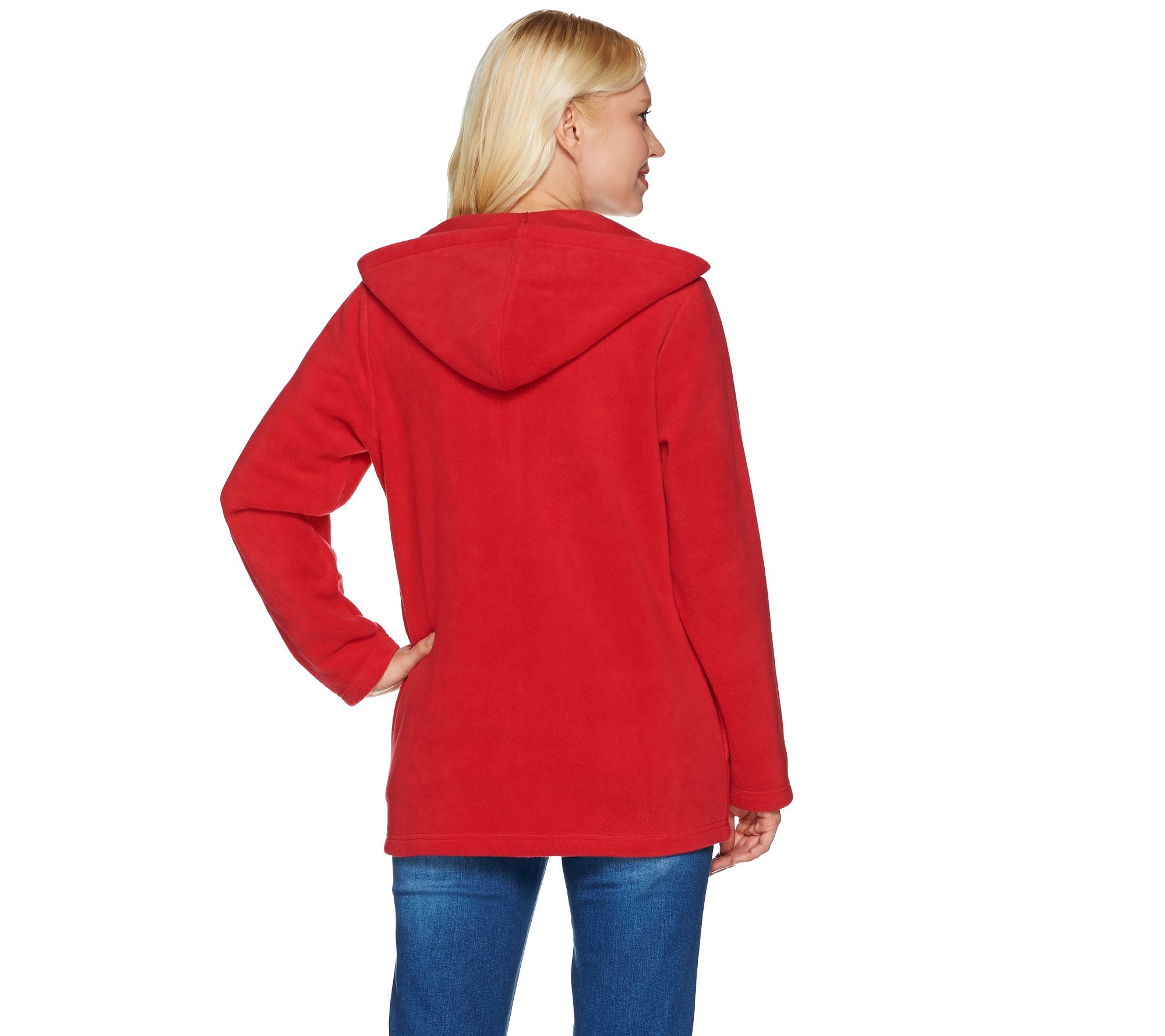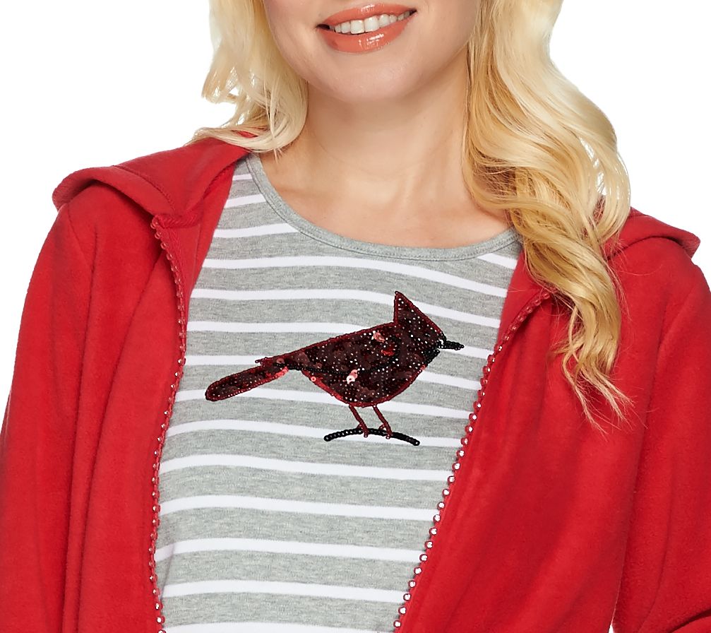 The set to get for style that gives you a reason to smile, Quacker Factory's fleece jacket and T-shirt are perfectly paired for your fall festivities. Wear the long-sleeved, striped tee alone to show off its fun-loving, cool-weather motif on the front, or layer the hooded fleece jacket over the shirt. Either way, this transitional set gives you plenty of ways to wake up your wardrobe with whimsy. A sequined embellishment on the T-shirt front and a rhinestone zipper on the jacket let you share your shining personality with all. At this value, it's easy to augment your autumn and winter attire by getting more than one set--each one offering different colors and motifs so you'll never run out of fabulous fashion statements. From Quacker Factory.