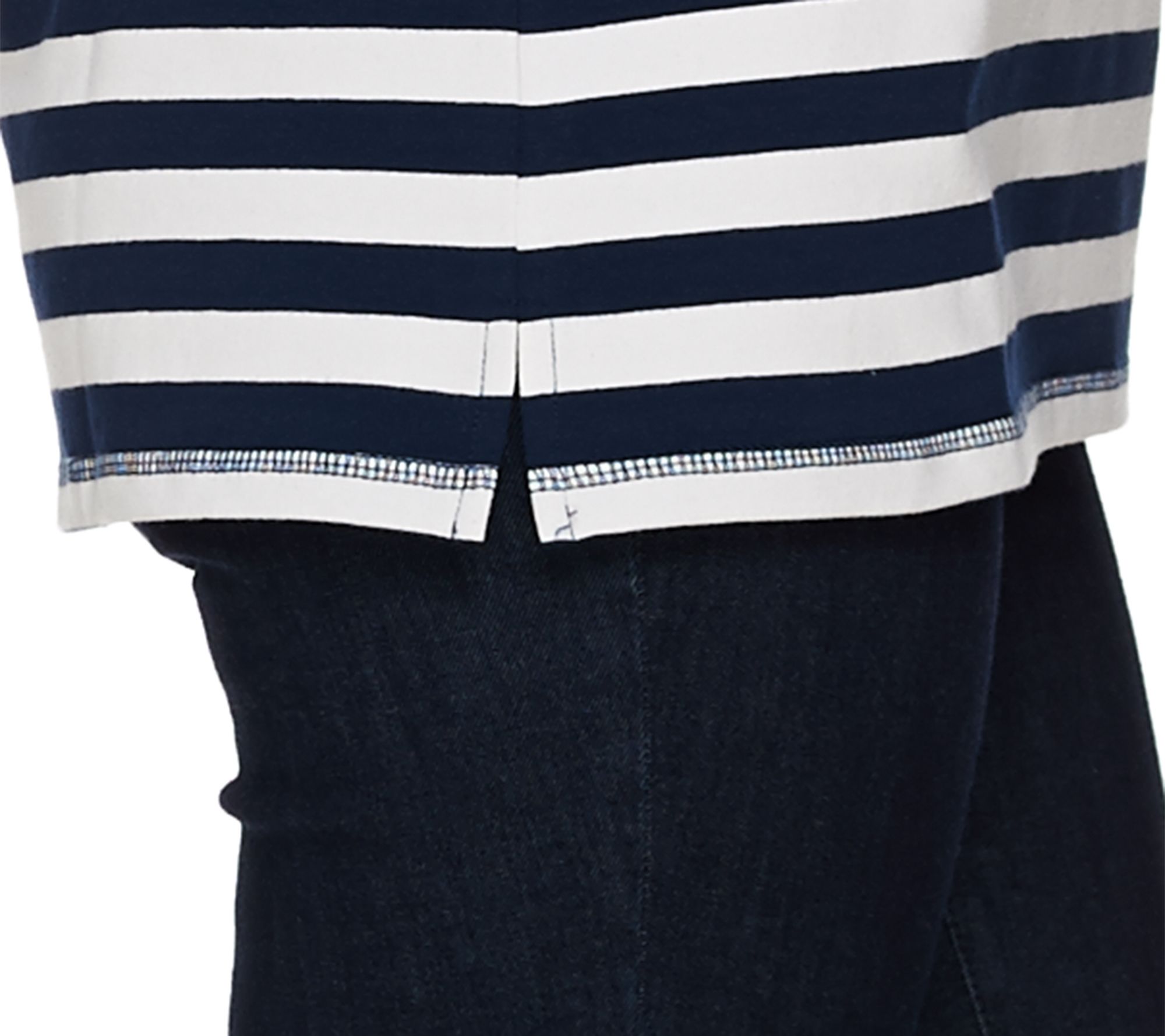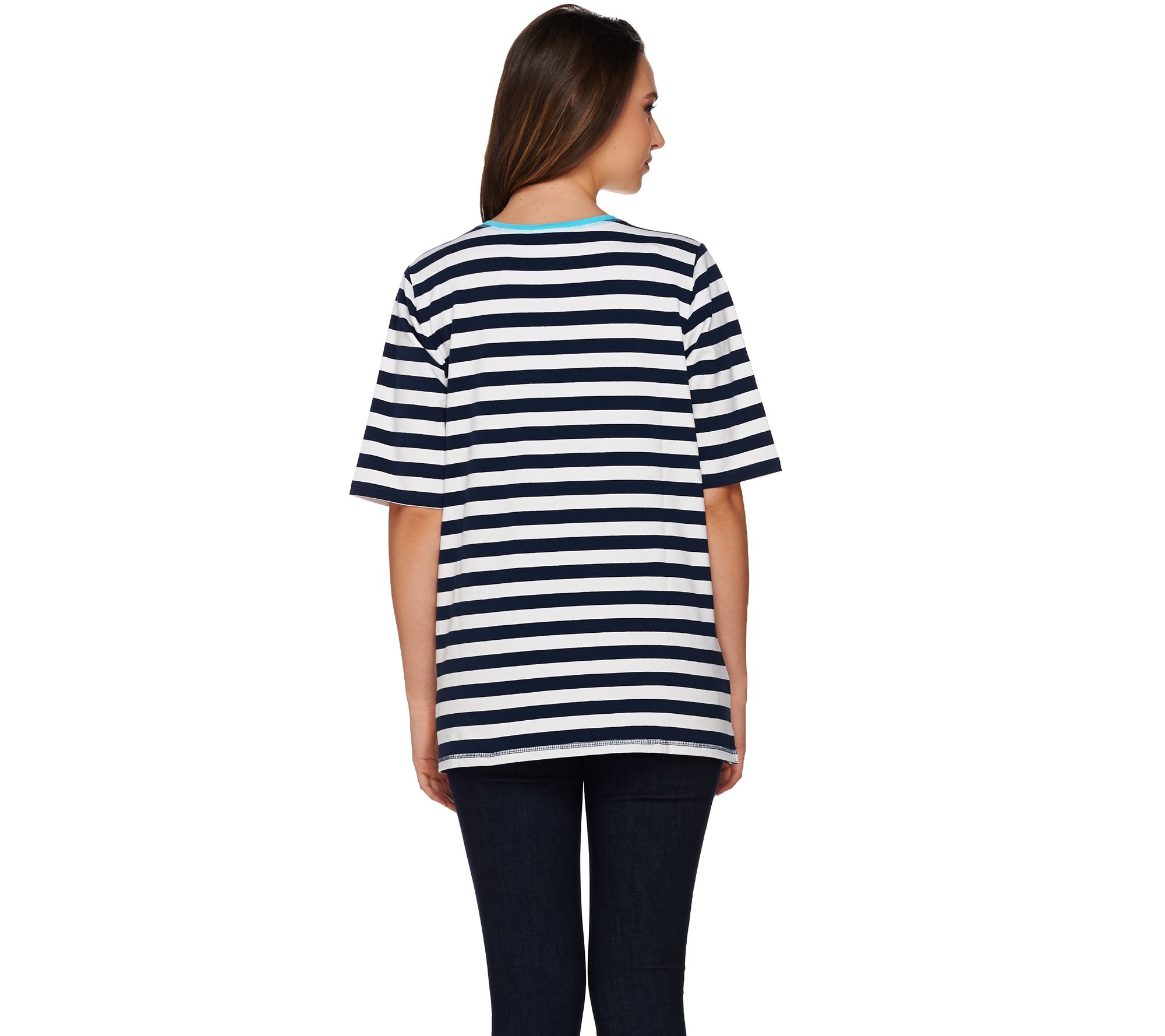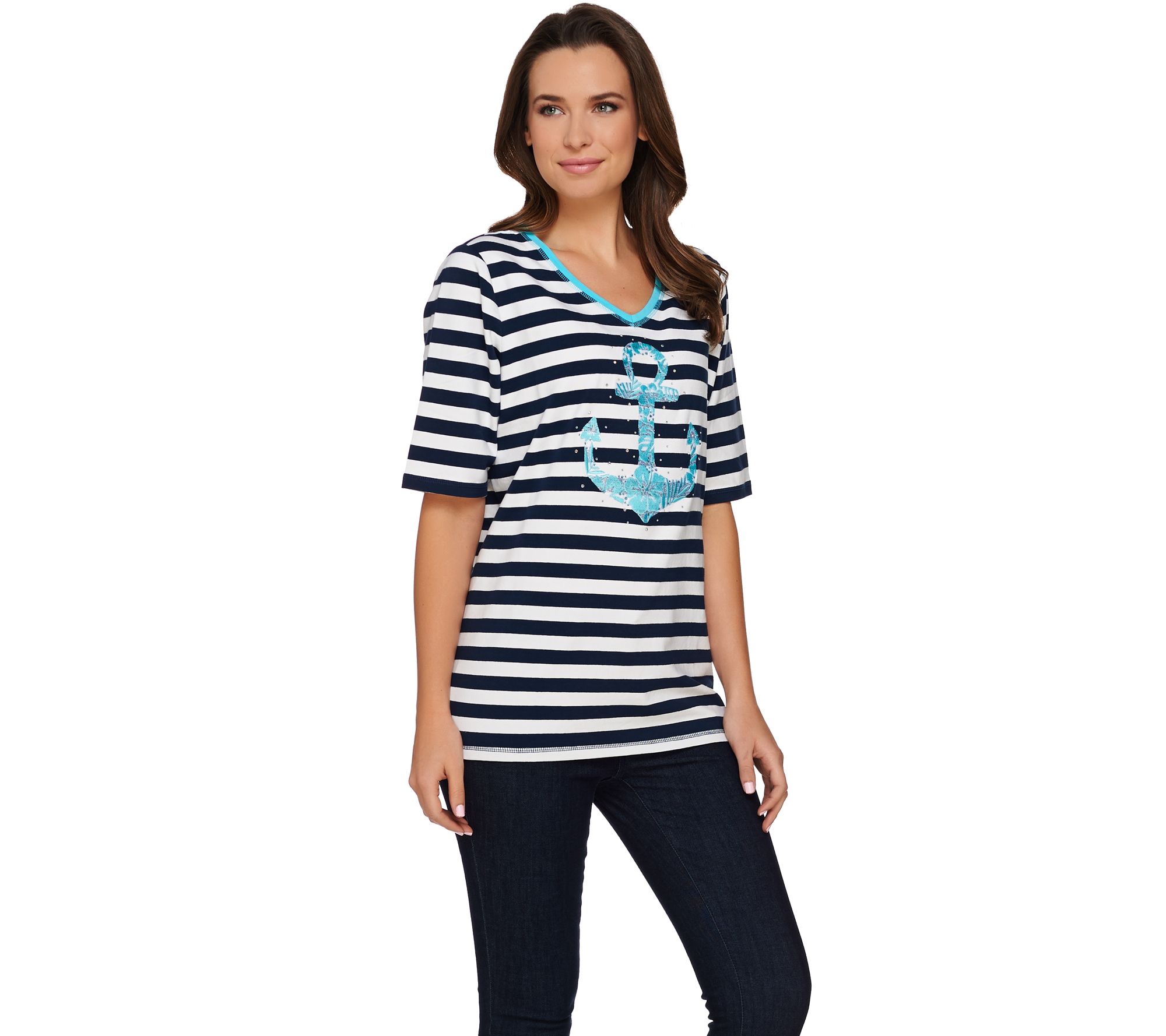 Keep your spirits high with this nautical-themed T-shirt from Quacker Factory(R). An allover striped pattern provides a bold background for the floral-embroidered anchor design, with rhinestone embellishments for an extra spot of sparkle. From Quacker Factory.