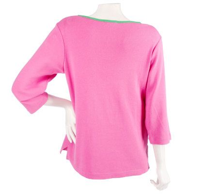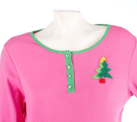 Hit the streets in sweetly coordinated style, wearing this henley shirt and carrying its matching tote. Knot embroidery details the front of the shirt as well as the tote. So easy, so you. From Quacker Factory.
