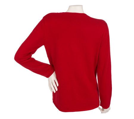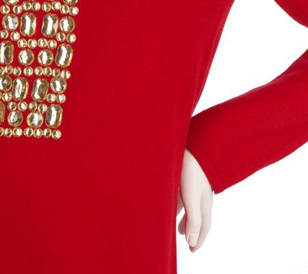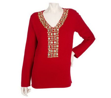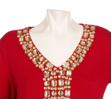 There's nothing shy about this stunning sweater. Bold jewel embellishments run along the V-neckline and down the front for rockin' sparkle. From Quacker Factory.