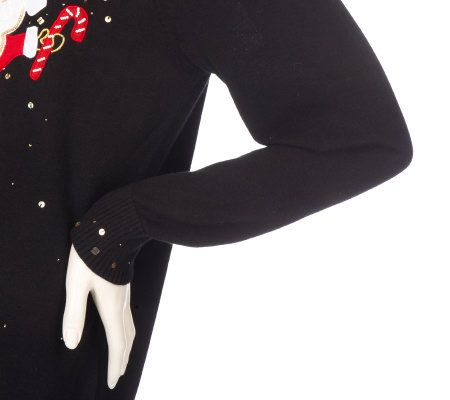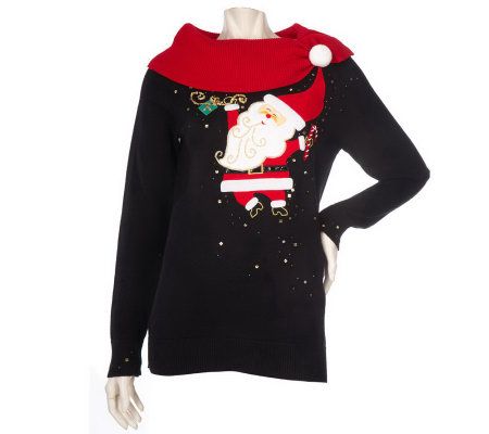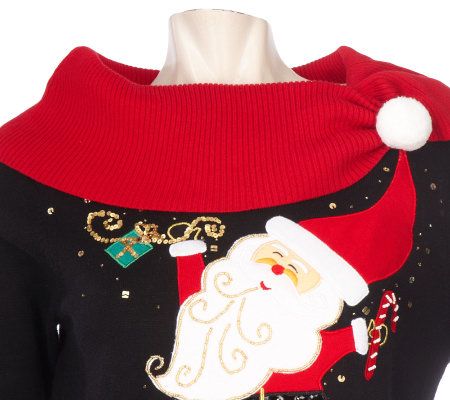 Why is Santa doing a happy dance across this festive holiday sweater? Maybe it's because the face-framing boat neckline makes you look so fabulous! Beads, sequins, and embroidery add extra pops of fun. From Quacker Factory.