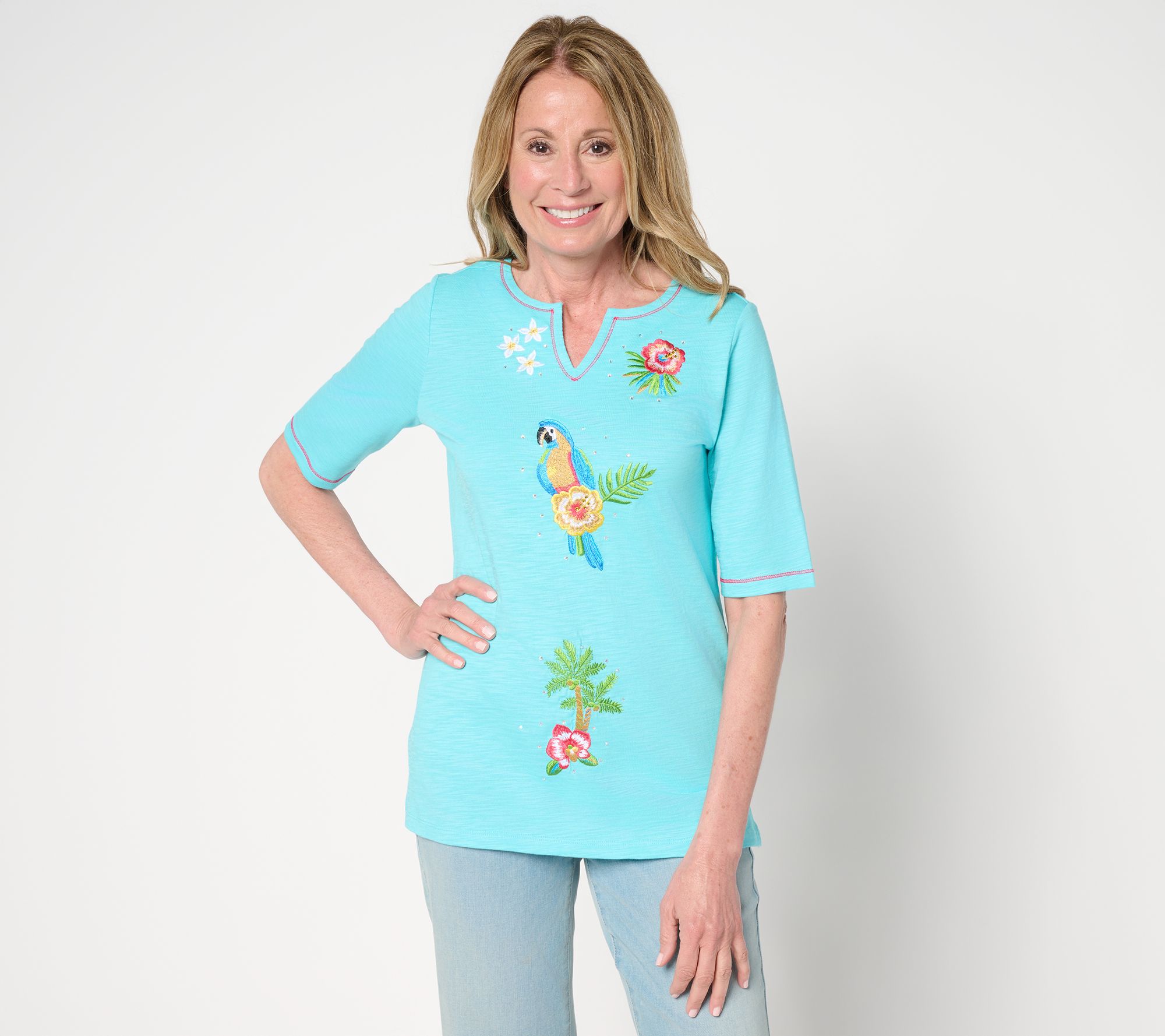 Bring festive flair to your day with this Hibiscus Holiday split-neck top, featuring a lively tropical design embroidered and embellished across the front. Elbow sleeves and contrast stitching add an extra dose of charm, while side slits at the hem invite easy movement for relaxed gatherings or weekend getaways. This semi-fitted knit is a bright pick for pairing with pants, crops, or shorts. From Quacker Factory®.