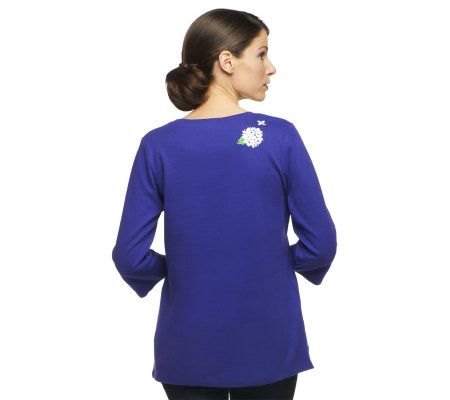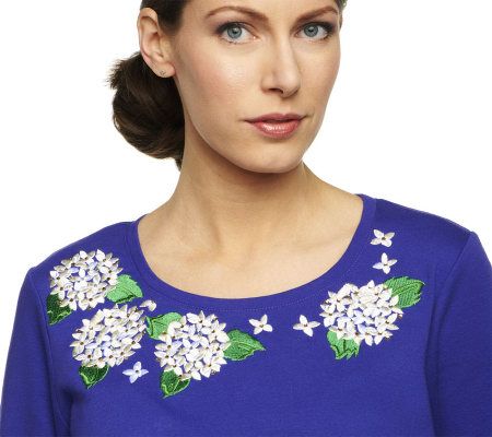 Springtime style in bloom. Embroidered hydrangeas sprout up around the collar line of this scoop-neck T-shirt. A perfectly pretty pick for the season. From Quacker Factory.