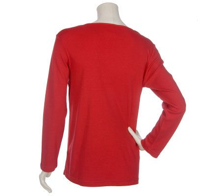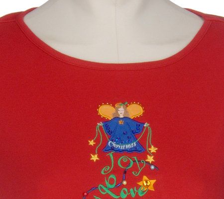 Spark your holiday spirit with this long-sleeved knit top. An embroidered holiday motif brings cheer to the front of the design. From Quacker Factory.