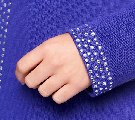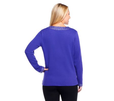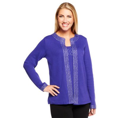 Get the look of a top and matching jacket--without the bulk of two separate layers--in this duet top. It's embellished with studs along the neckline, placket, and inset. From Quacker Factory(R).