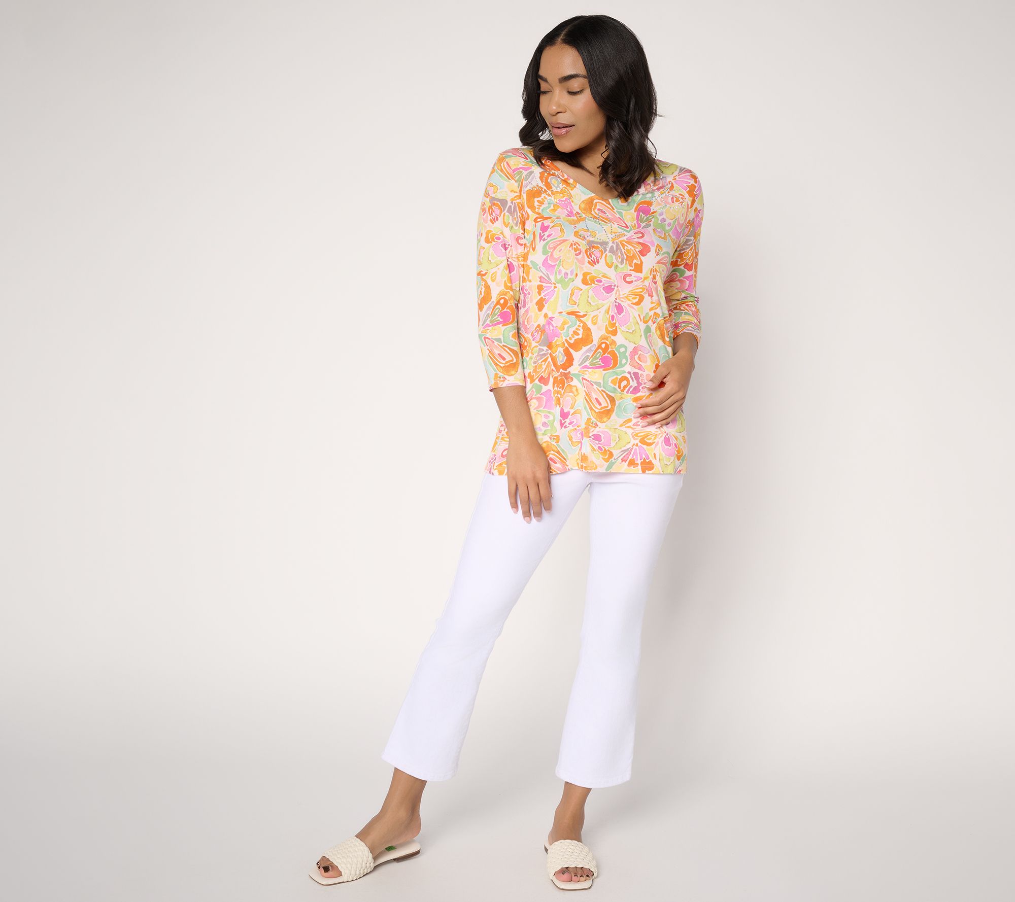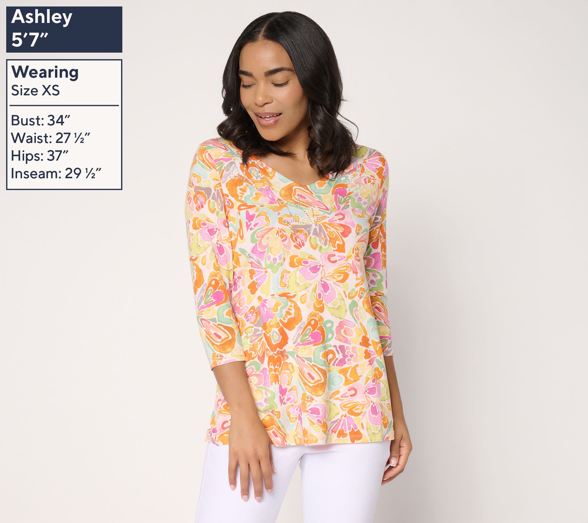 Butterfly embellishments flutter across this knit top, adding sparkling charm whether you're pairing it with jeans for a casual brunch or slipping it on with dressy pants for an evening out. A V-neckline and 3/4-length sleeves create a timeless look, while the straight hem keeps your silhouette sleek and easy to style. From Quacker Factory®.