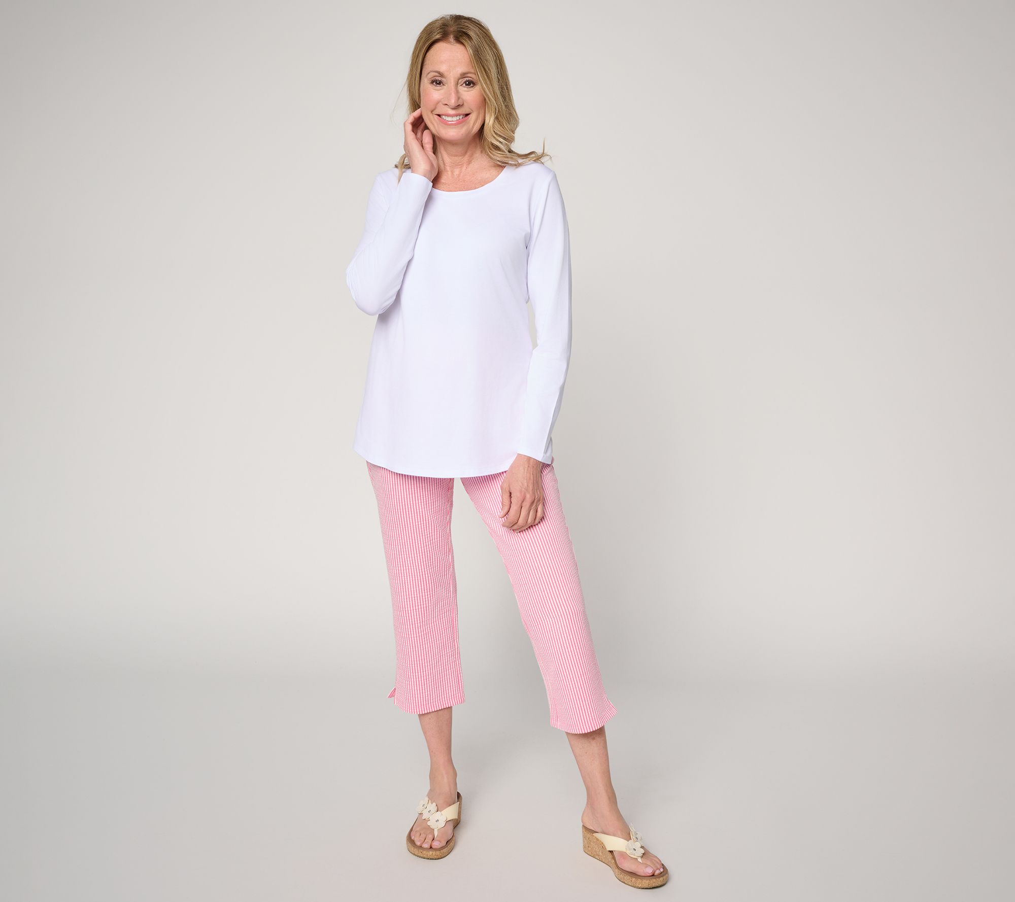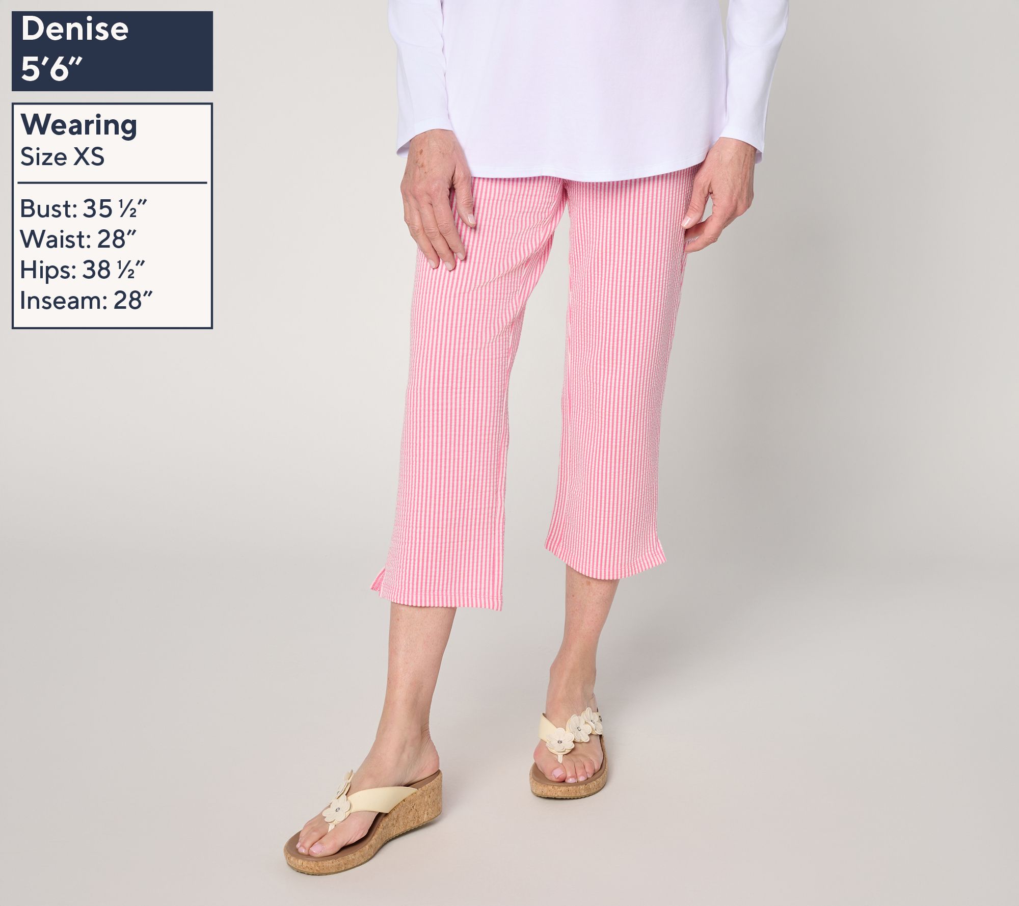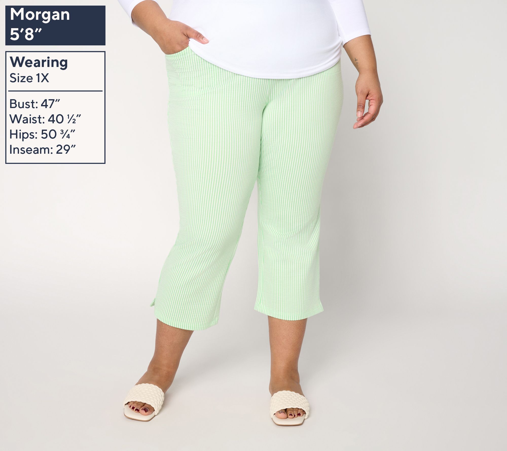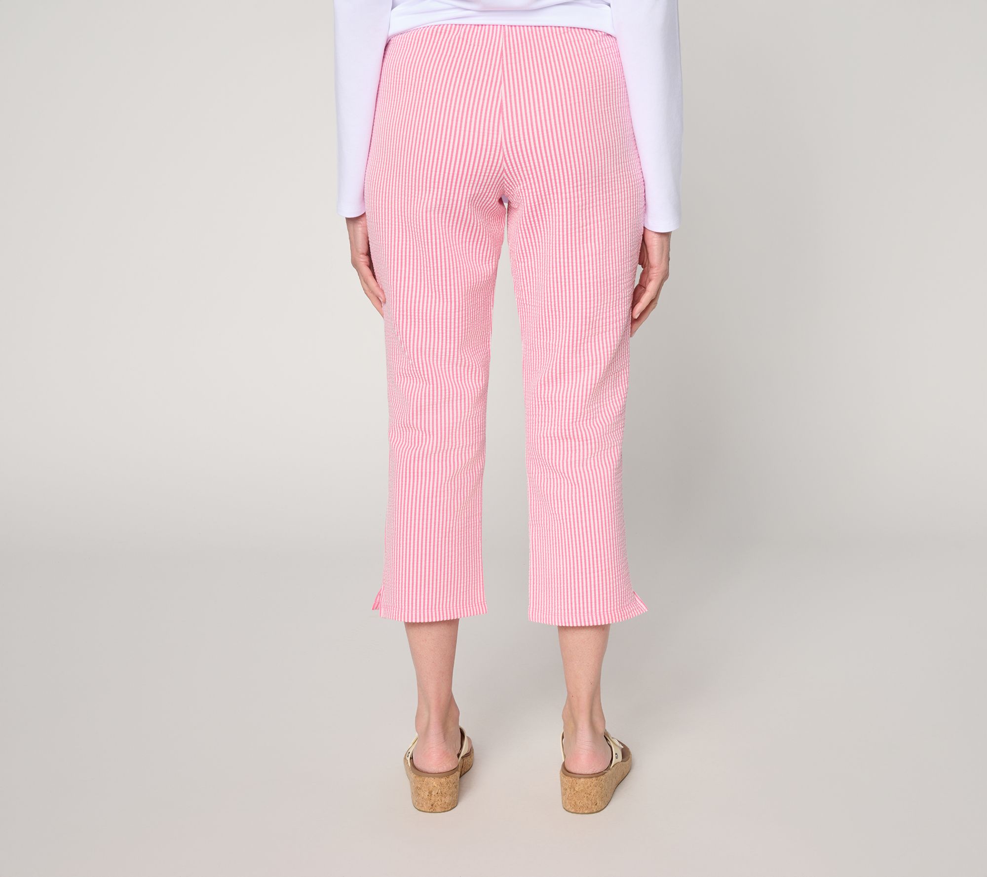 Seersucker means warmer weather is around the corner! Sun-soaked days call for Quacker Factory's knit crop pants, crafted in lightweight seersucker for elegance with a side of ease. Subtle slits at the hem and side pockets add everyday practicality, making these crops a wear-on-repeat winner for everything from park strolls to casual coffee catch-ups. From Quacker Factory®.