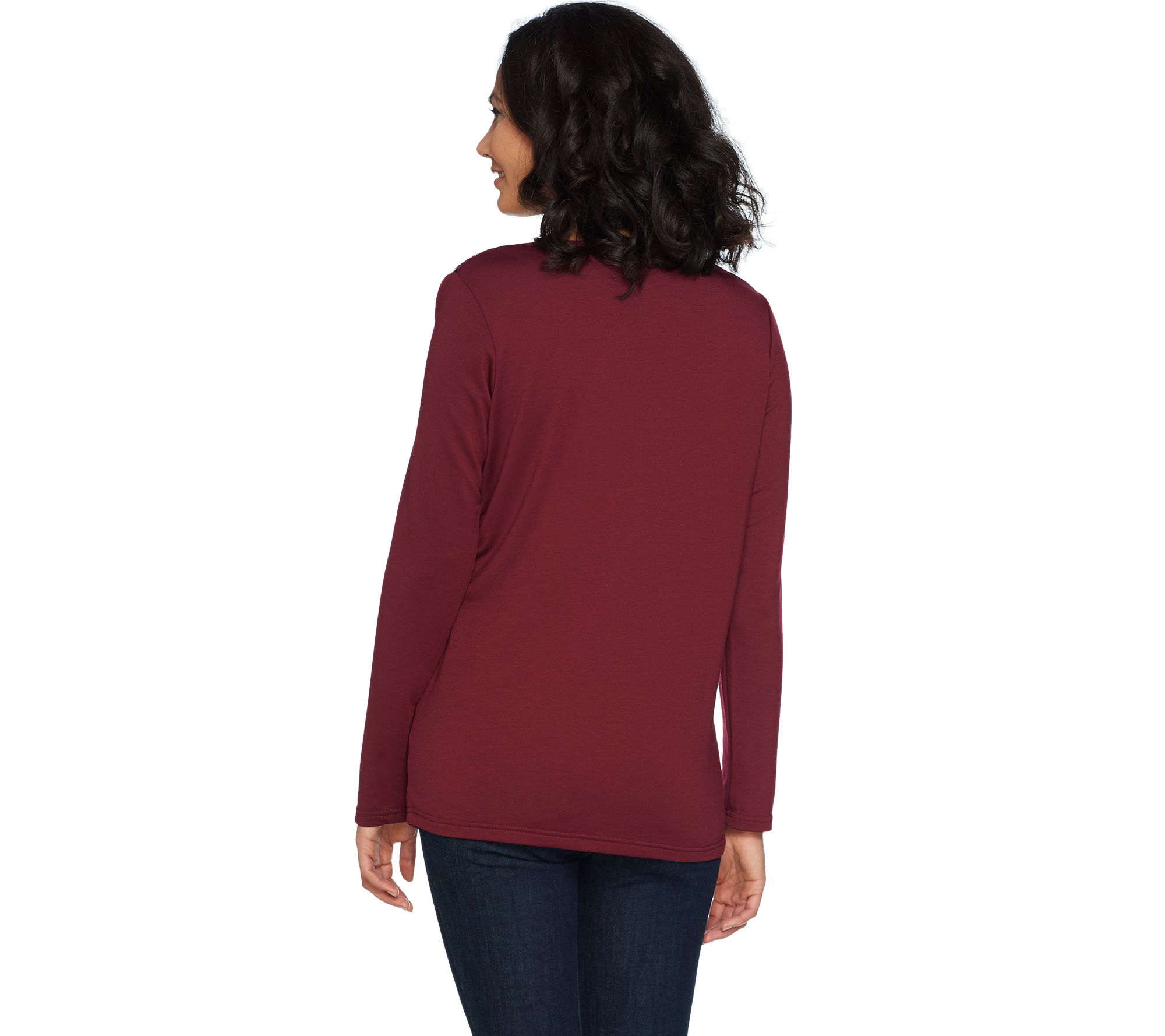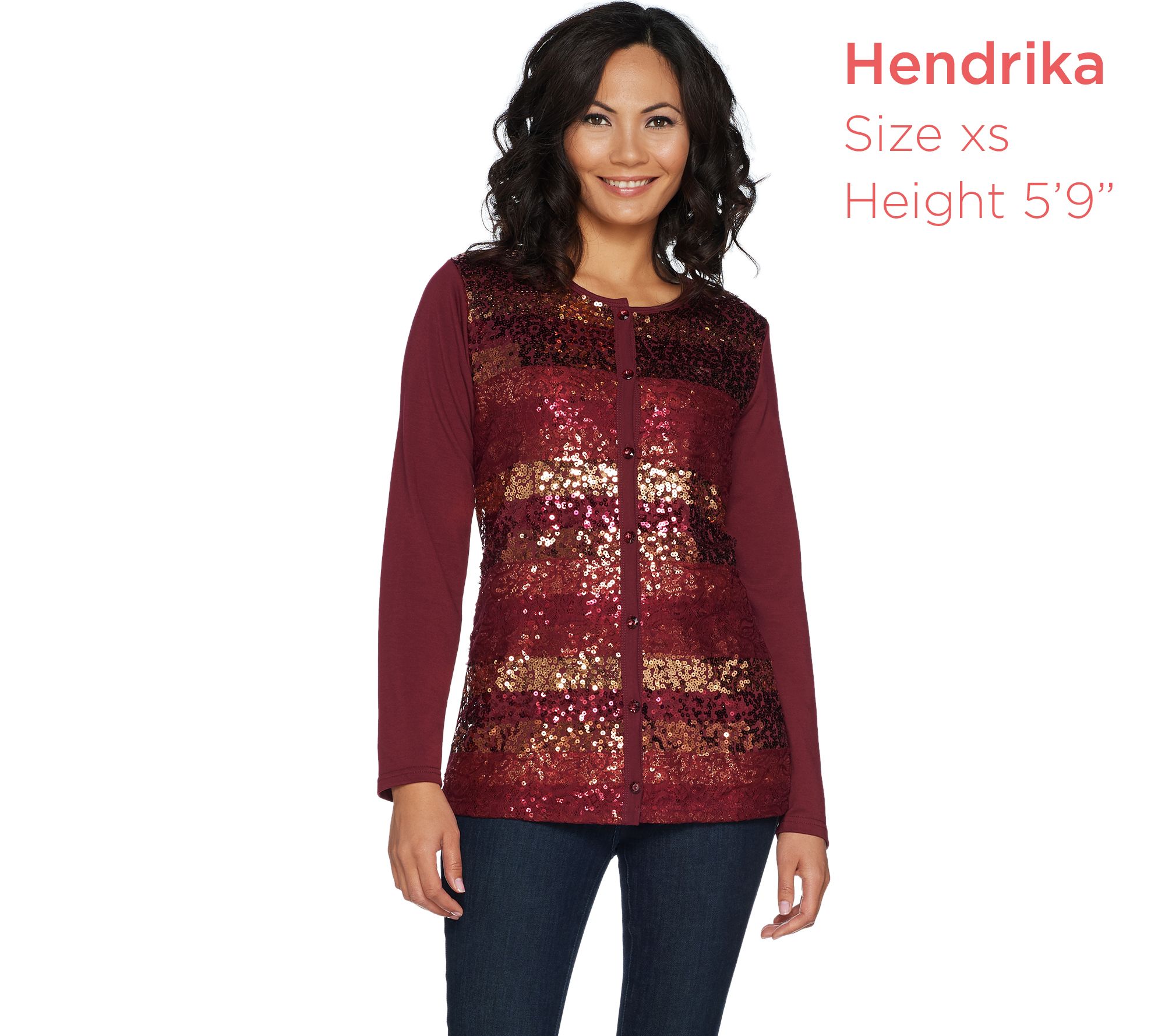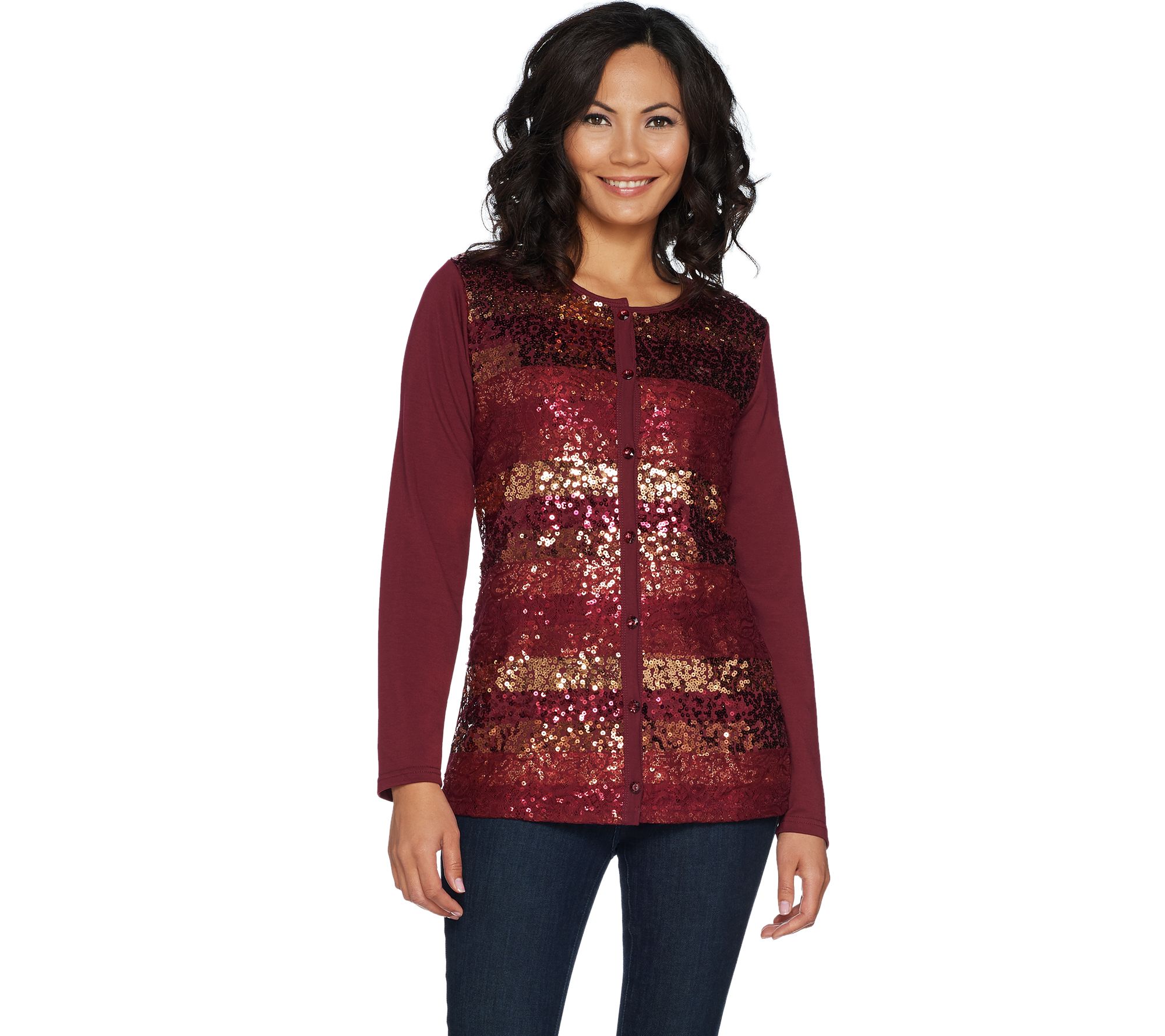 When the weather says it's time for a sweater, light up the room with this cardi's sassy lace and sequins styling. From Quacker Factory(R).