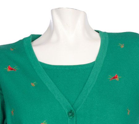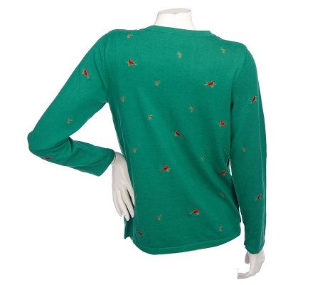 The cardinal rules. Sweet, red, embroidered cardinals grace this long-sleeved duet sweater. A casual and comfortable topper that looks great with jeans or a skirt. From Quacker Factory.