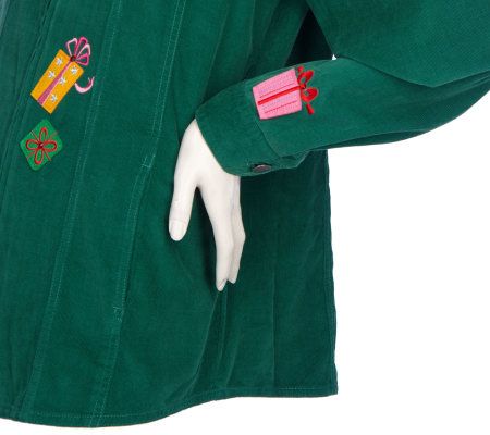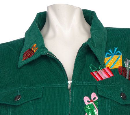 Wrap up a festive holiday outfit with this stylish corduroy jacket. It's designed with adorable embroidered presents, chest pockets, and a full-zip front. From Quacker Factory.