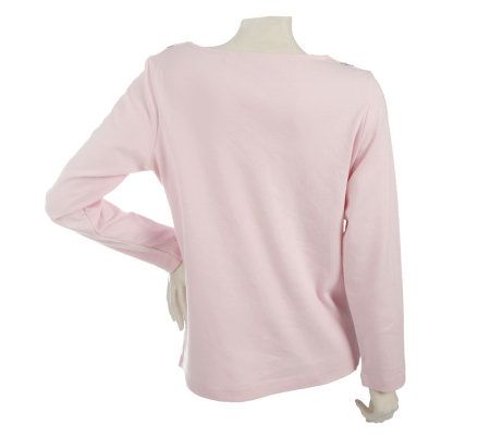 Superb shimmer. Set your wardrobe's style magnitude on dazzle with this eye-catching long-sleeved T-shirt. Sparkling sequin embellishments accent its notched V-neckline for a look that's a perfect casual match for your favorite jeans or corduroys. From Quacker Factory.