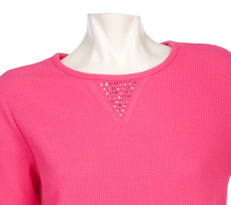 Way to work your wardrobe. This comfy waffle tee has a lot to offer, including stud detailing at the center of the crew neckline. From Quacker Factory.