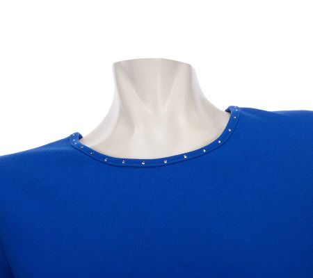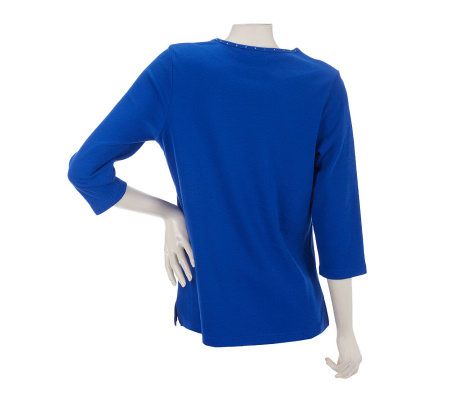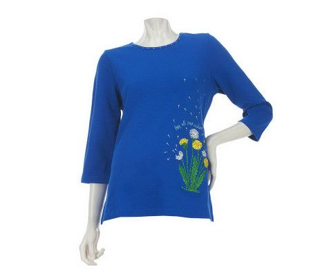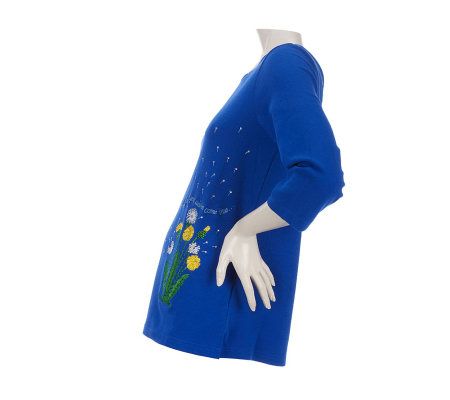 Say it with sparkle. Looking for the perfect T-shirt to match your upbeat attitude? Slip on this 3/4-sleeve tee and broadcast your optimism loud and clear. Rhinestones embellish the neckline and accent the bottom, which features flowers and the message "May All Your Wishes Come True." From Quacker Factory.