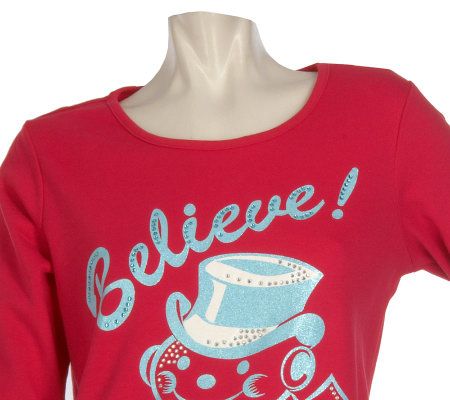 Recapture that childhood holiday feeling with this whimsical tee. The old-fashioned Christmas design at the center is accented with rhinestones for festive sparkle. From Quacker Factory.