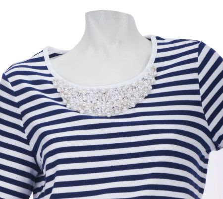 Sail through getting dressed in the morning when you launch your ensemble with this nautical striped tee. Pearls and beads along the neckline let you leave your necklace at home. From Quacker Factory.