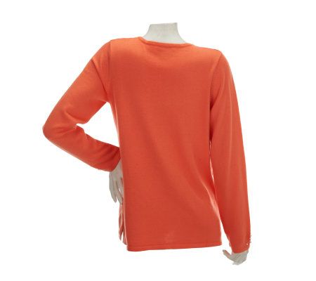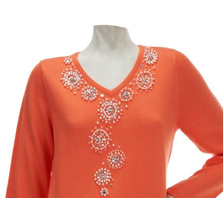 Pretty, please? Your wish is our command. Embellished with rhinestones and simulated pearls, the mission of this V-neck sweater is to make you look fabulous. From Quacker Factory.