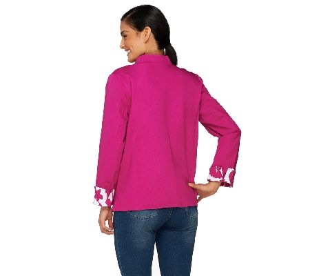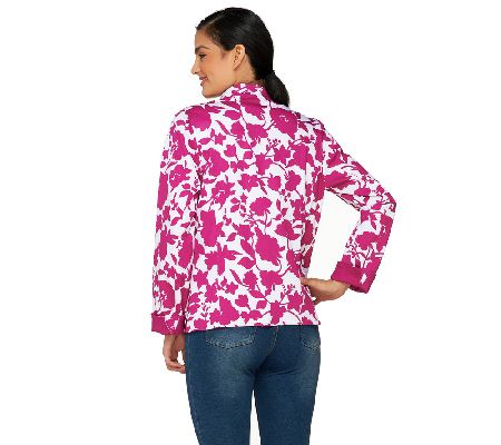 The ins and outs of fashion. Reversing from a floral print to a coordinating solid, this woven, zip-front jacket shows you're in the know when it comes to today's style. Rhinestone accents add a touch of sparkle. From Quacker Factory(R).
