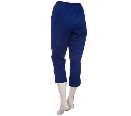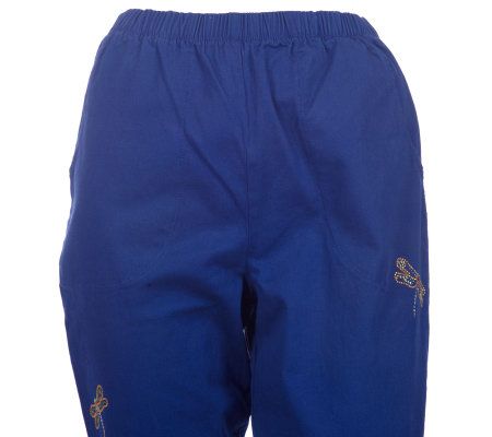 Hot buzz. Put a little zip in your stride with these stylish cropped leggings, decorated with dragonfly embellishments. A comfortable elastic waistband and two convenient front pockets make them nothing short of sensational. From Quacker Factory.