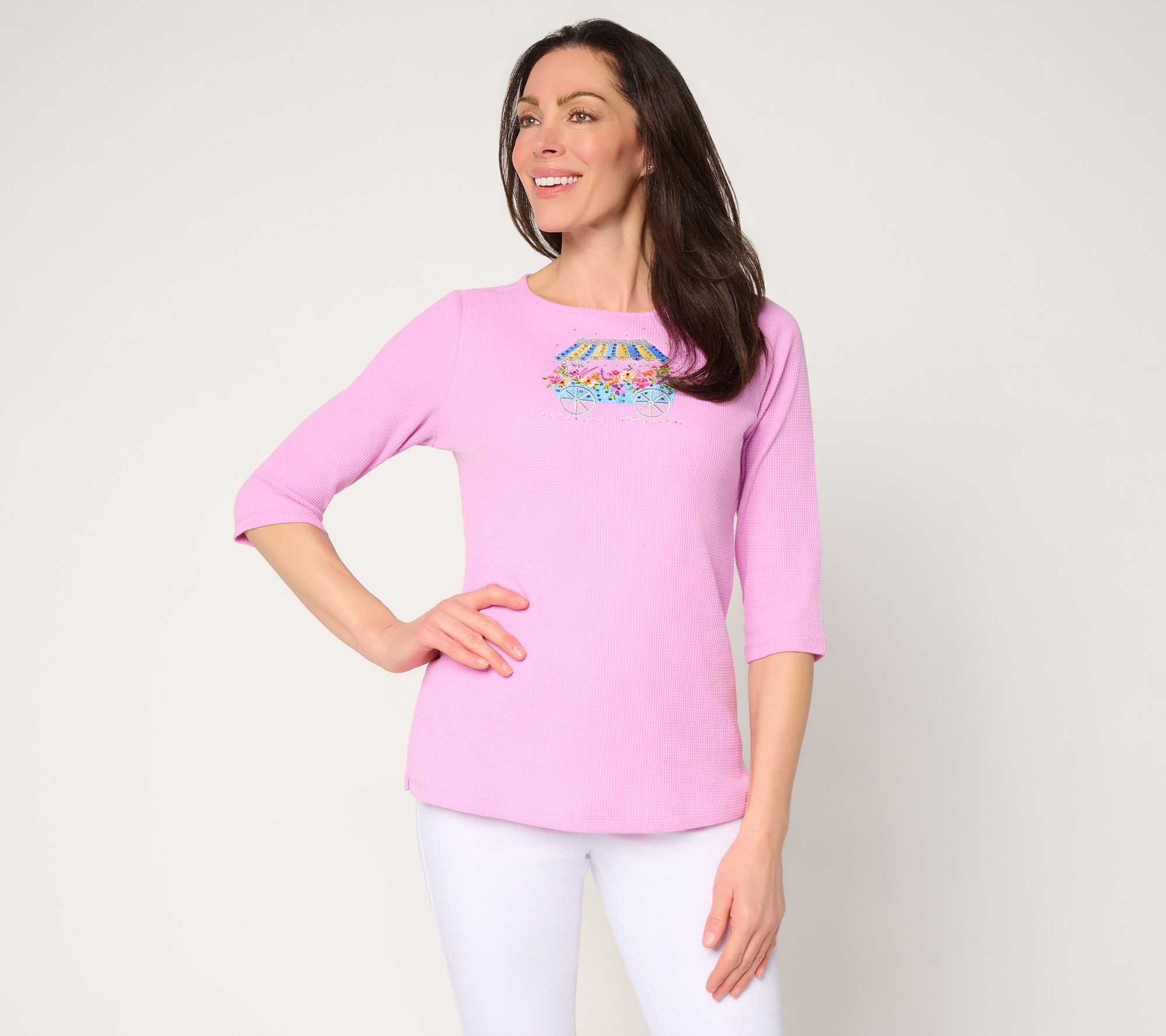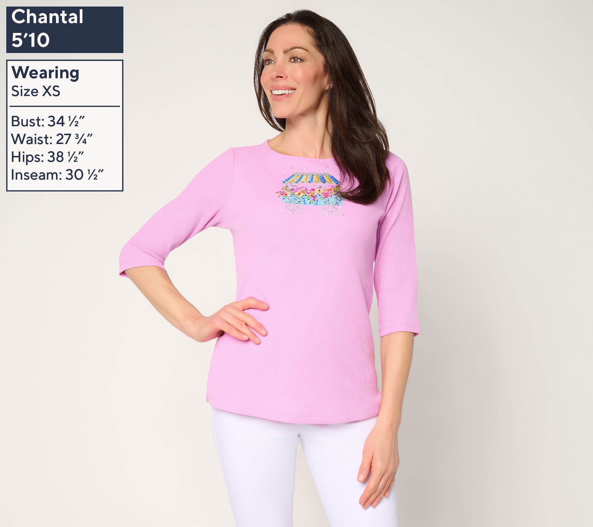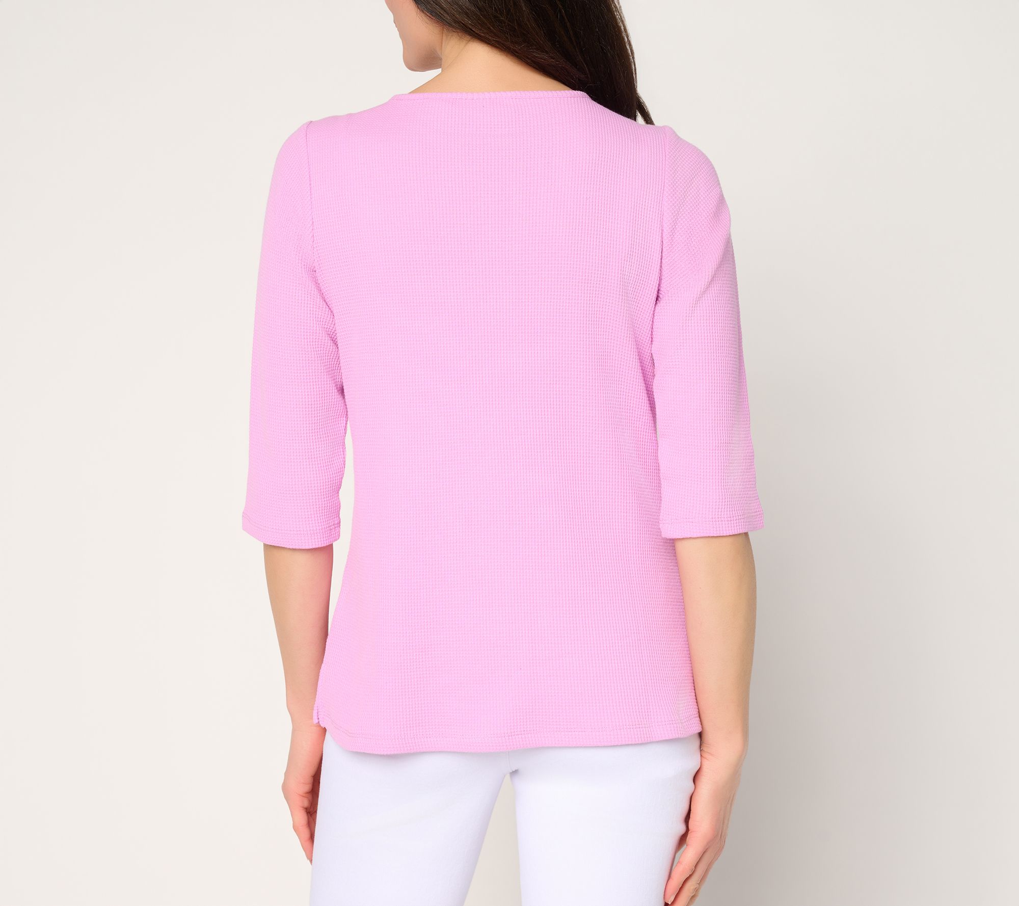 A weekend stroll or lunch with friends gets a cheerful boost with this waffle knit top, featuring a classic round neckline and easy 3/4-length sleeves. The soft cotton blend feels breezy, while a straight hem and side slits let you move with comfort from one moment to the next. From Quacker Factory®.