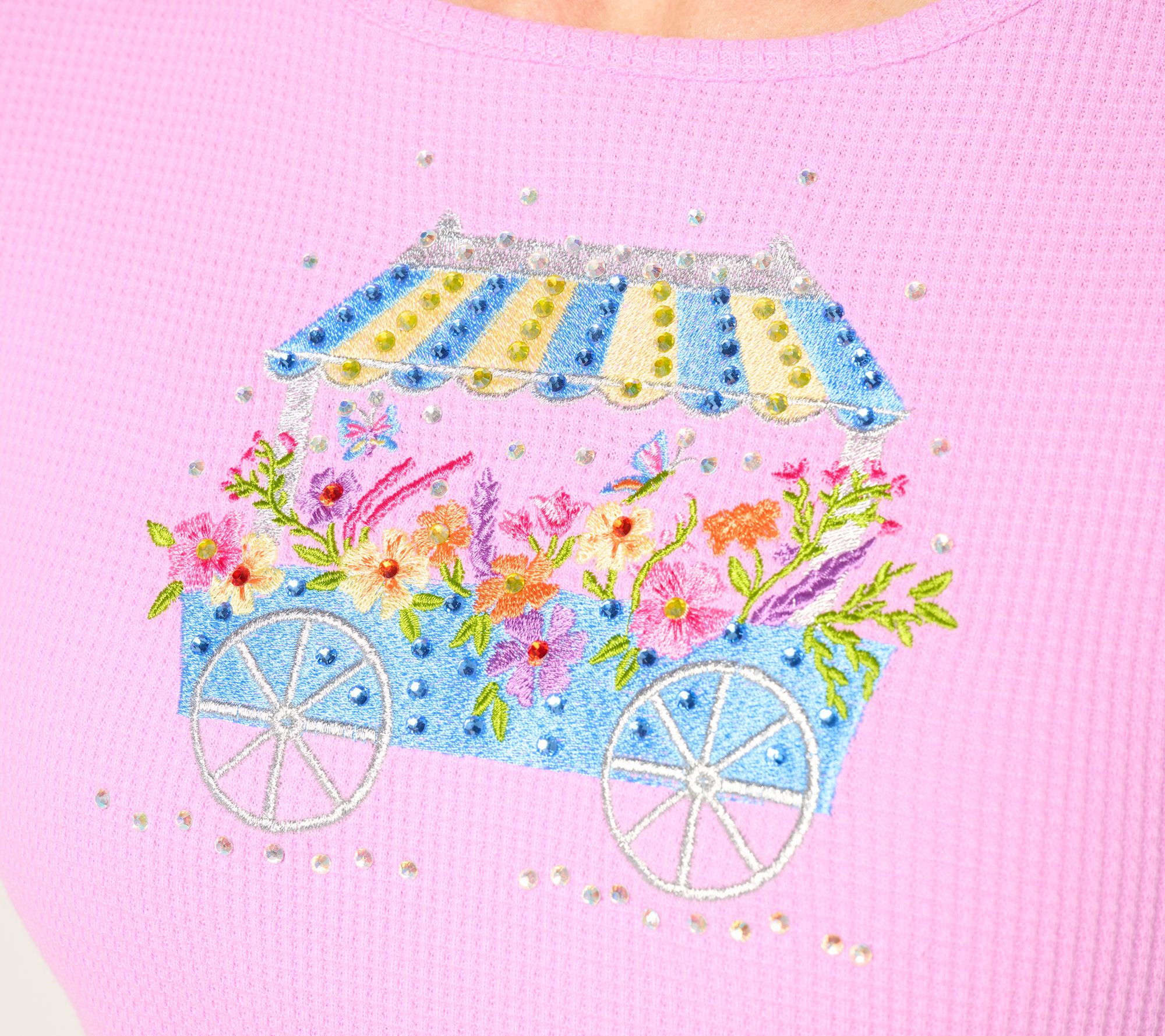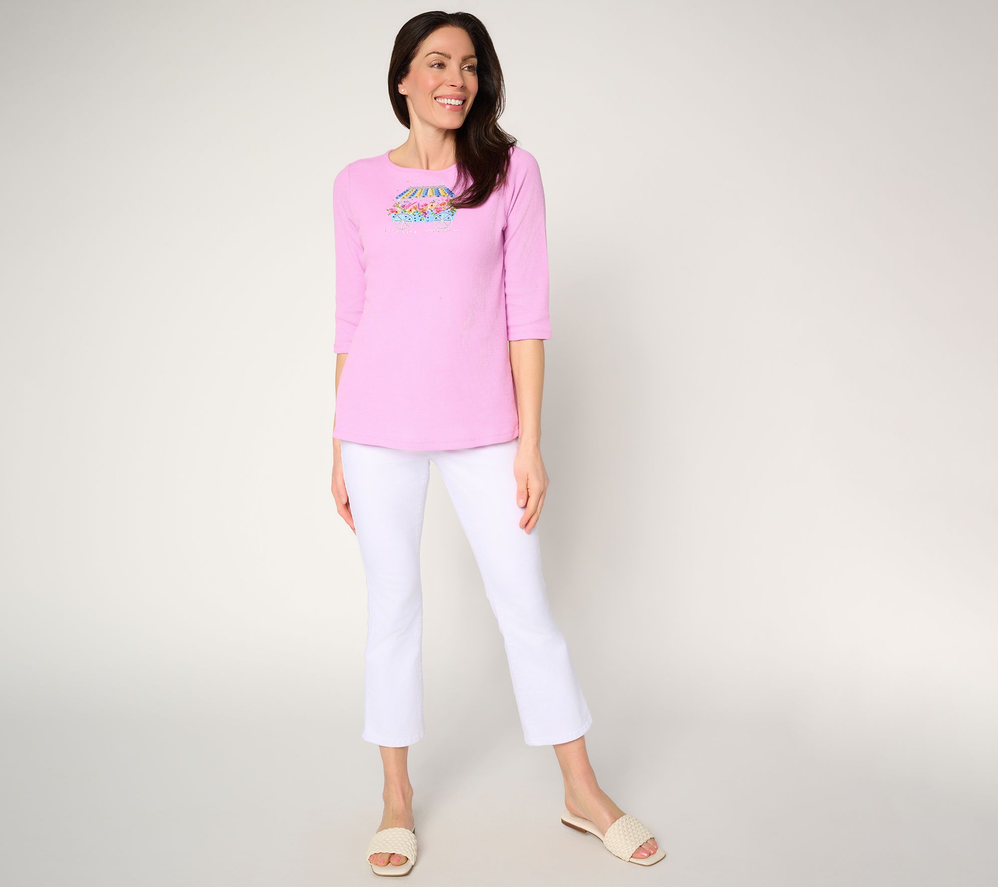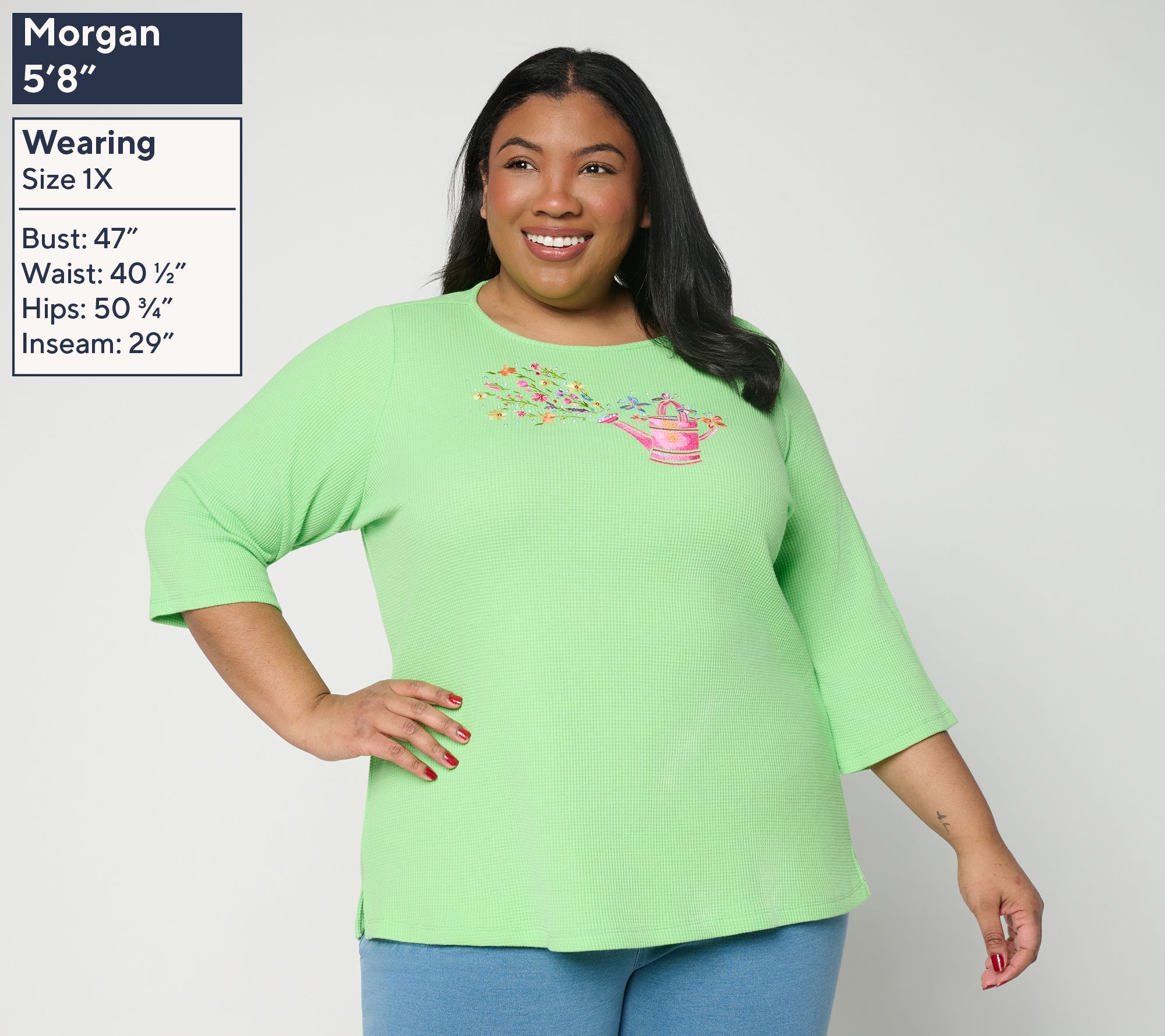 A weekend stroll or lunch with friends gets a cheerful boost with this waffle knit top, featuring a classic round neckline and easy 3/4-length sleeves. The soft cotton blend feels breezy, while a straight hem and side slits let you move with comfort from one moment to the next. From Quacker Factory®.