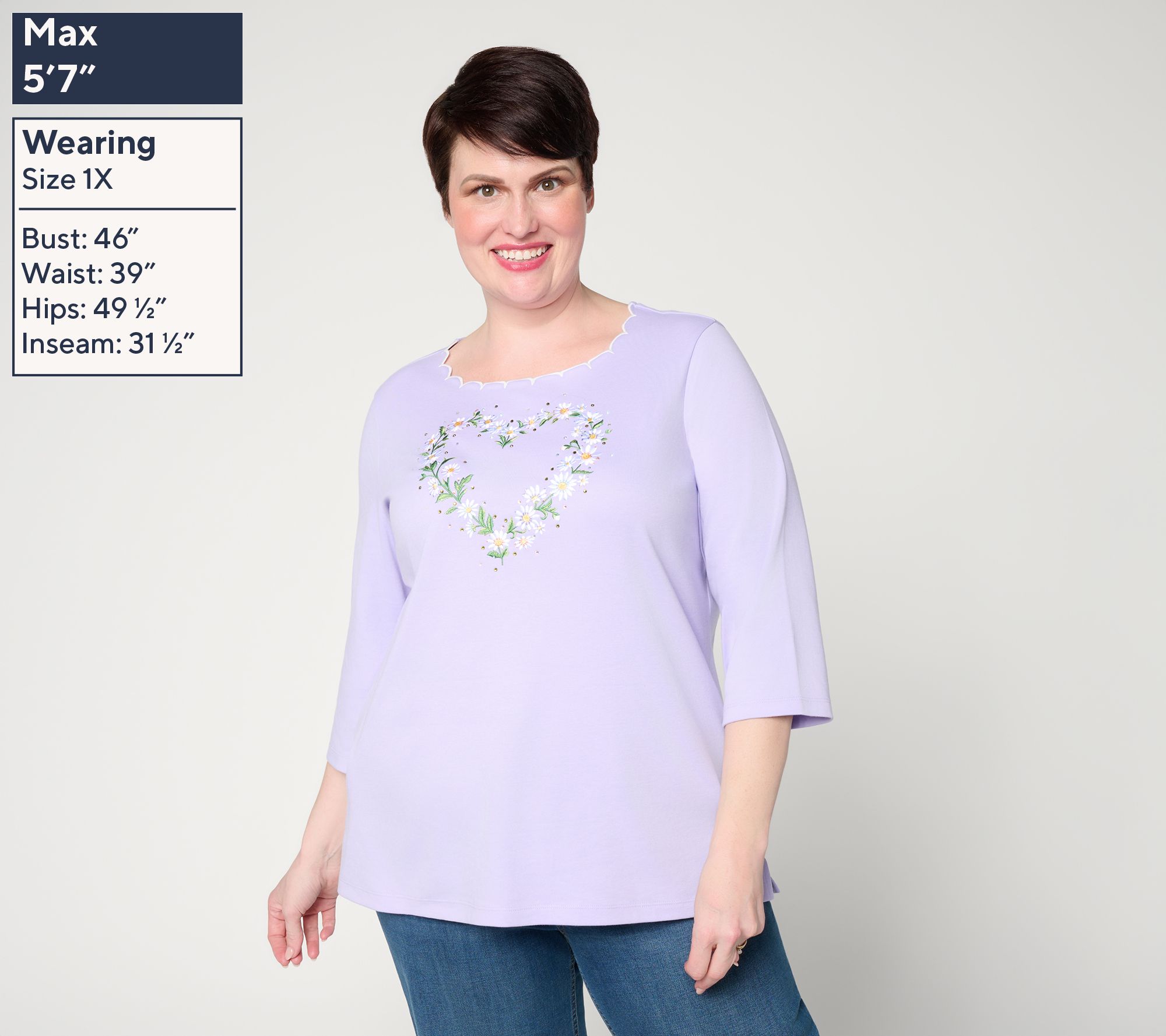 Brighten up coffee dates or weekend outings with the Seize the Daisy top, designed with a scalloped round neckline and playful side slits for a touch of flair. The soft, stay-awhile fabric keeps things easy, whether you're layering with your favorite jeans or pairing with capris for breezy style. From Quacker Factory®.