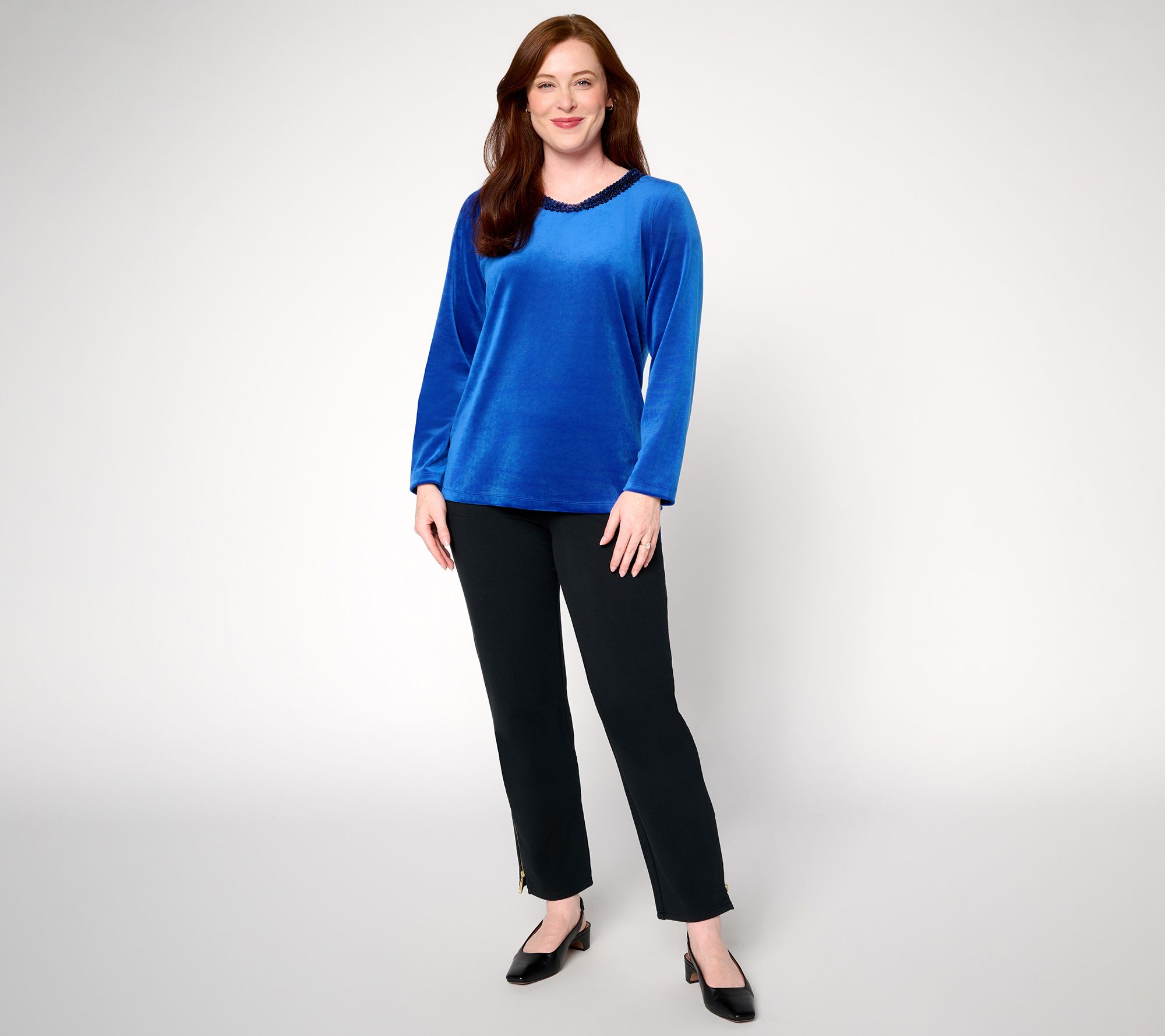 A shimmer of sequins makes every occasion feel special in this plush velour top. Long sleeves and a round neckline balance comfort with a flattering silhouette, while the hi-low hem and side slits add easy movement -- making it effortless for pairing with your favorite jeans or leggings for nights out or festive gatherings. From Quacker Factory®.